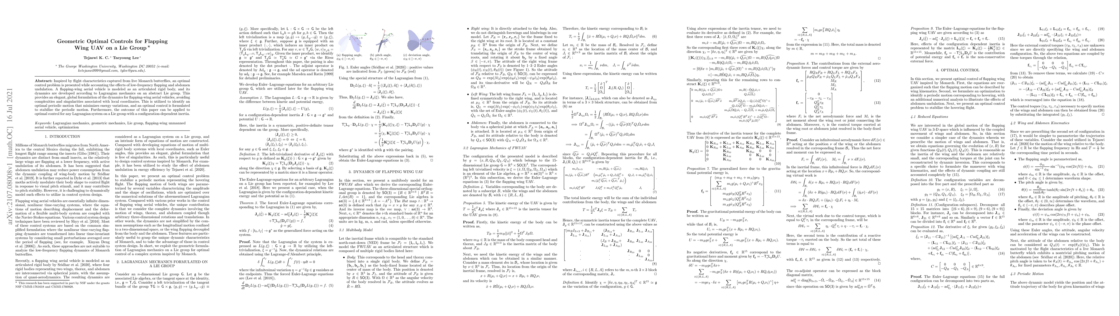 This paper develops an optimal control framework for a flapping-wing UAV modeled on Lie group dynamics, inspired by Monarch butterflies, to minimize energy variations and stabilize periodic motion. The approach avoids local coordinate complexities and can be extended to other Lagrangian systems with configuration-dependent inertia.