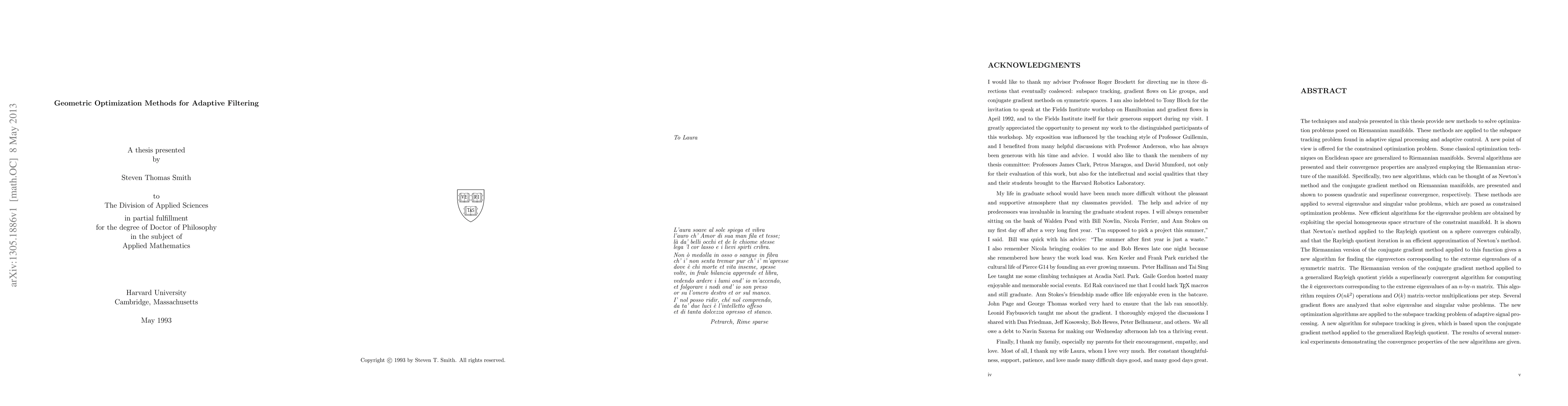 The techniques and analysis presented in this thesis provide new methods to solve optimization problems posed on Riemannian manifolds. These methods are applied to the subspace tracking problem found in adaptive signal processing and adaptive control. A new point of view is offered for the constrained optimization problem. Some classical optimization techniques on Euclidean space are generalized to Riemannian manifolds. Several algorithms are presented and their convergence properties are analyzed employing the Riemannian structure of the manifold. Specifically, two new algorithms, which can be thought of as Newton's method and the conjugate gradient method on Riemannian manifolds, are presented and shown to possess quadratic and superlinear convergence, respectively. These methods are applied to several eigenvalue and singular value problems, which are posed as constrained optimization problems. ...