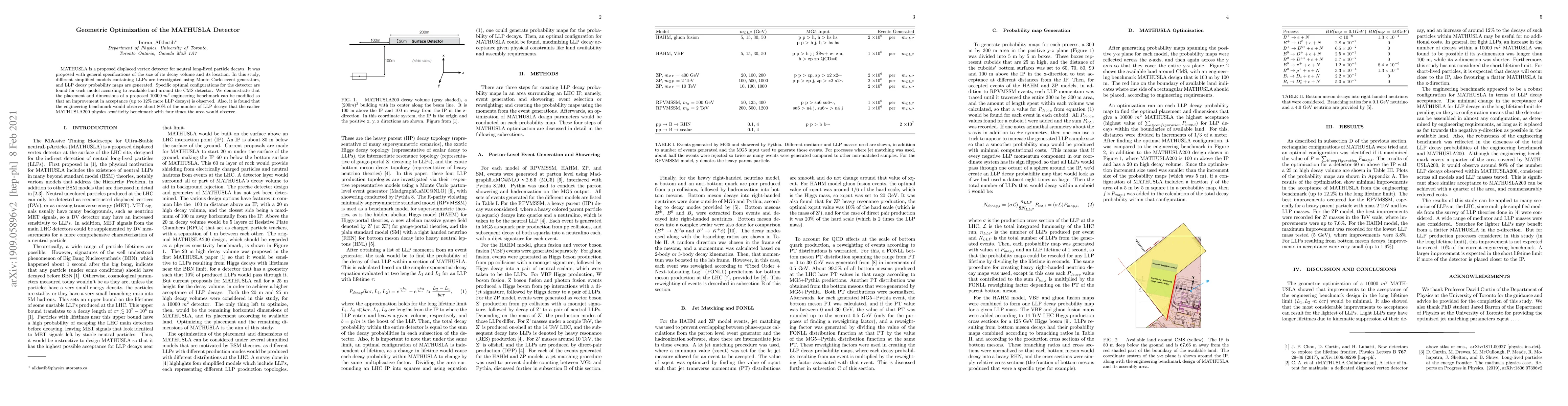 This study optimizes the geometric configuration of the MATHUSLA detector, designed to observe neutral long-lived particle decays, using Monte Carlo simulations. It finds that a modified 10,000 m² benchmark can achieve up to 12% more decay acceptance compared to earlier benchmarks, while observing about 80% of the decays detectable by a larger, four-times-area benchmark.