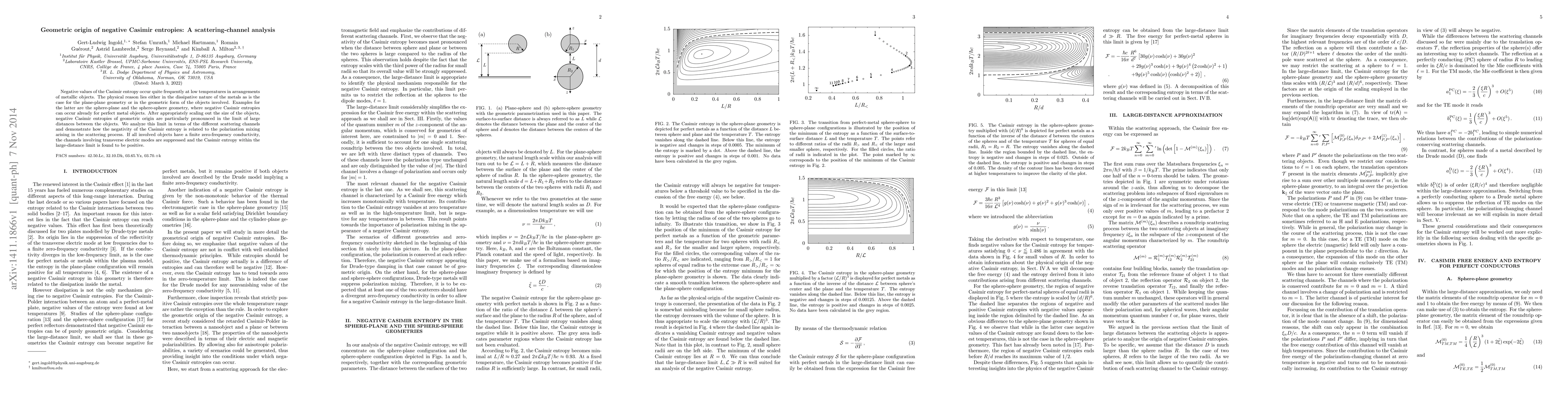 Negative values of the Casimir entropy occur quite frequently at low temperatures in arrangements of metallic objects. The physical reason lies either in the dissipative nature of the metals as is the case for the plane-plane geometry or in the geometric form of the objects involved. Examples for the latter are the sphere-plane and the sphere-sphere geometry, where negative Casimir entropies can occur already for perfect metal objects. After appropriately scaling out the size of the objects, negative Casimir entropies of geometric origin are particularly pronounced in the limit of large distances between the objects. We analyze this limit in terms of the different scattering channels and demonstrate how the negativity of the Casimir entropy is related to the polarization mixing arising in the scattering process. If all involved objects have a finite zero-frequency conductivity, the channels involving transverse electric modes are suppressed and the Casimir entropy within the large-distance limit is found to be positive.