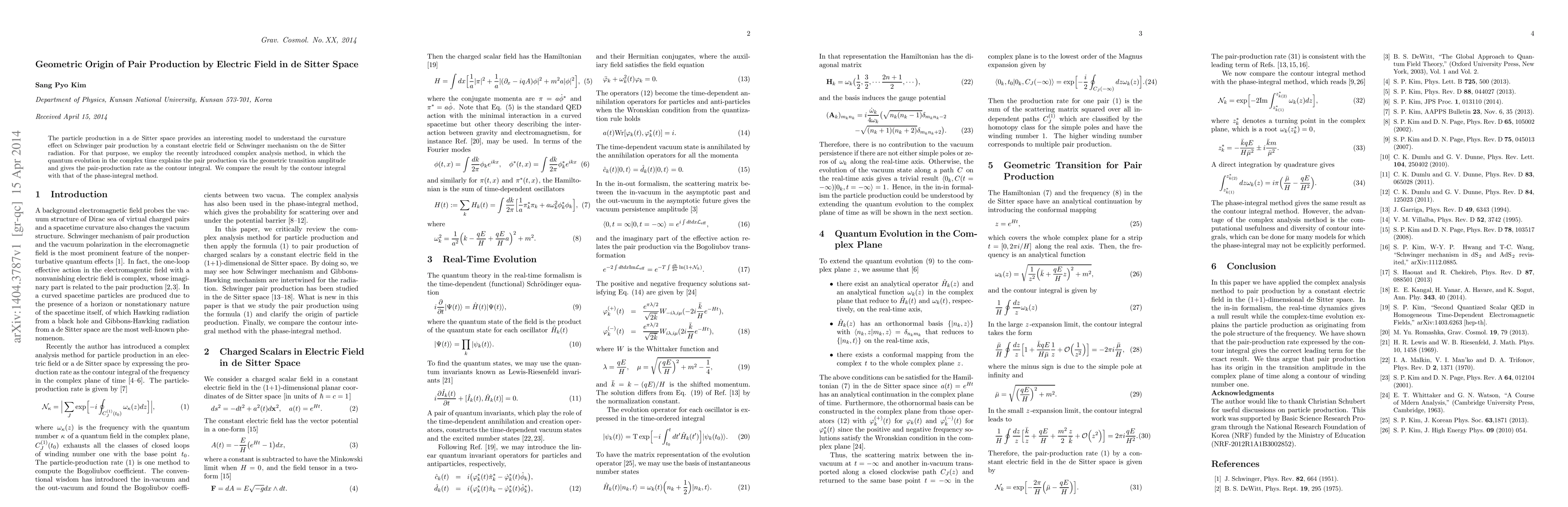 This paper investigates the geometric origin of Schwinger pair production in de Sitter space using complex analysis, revealing the curvature effect on particle creation via a constant electric field. The study employs a contour integral approach to derive the pair-production rate and compares it with the phase-integral method.