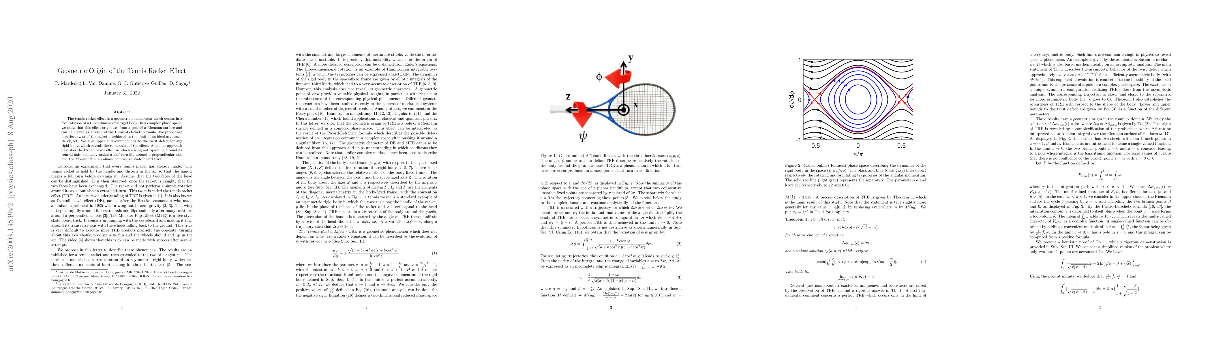 The tennis racket effect is a geometric phenomenon which occurs in a free rotation of a three-dimensional rigid body. In a complex phase space, we show that this effect originates from a pole of a Riemann surface and can be viewed as a result of the Picard-Lefschetz formula. We prove that a perfect twist of the racket is achieved in the limit of an ideal asymmetric object. We give upper and lower bounds to the twist defect for any rigid body, which reveals the robustness of the effect. A similar approach describes the Dzhanibekov effect in which a wing nut, spinning around its central axis, suddenly makes a half-turn flip around a perpendicular axis and the Monster flip, an almost impossible skate board trick.