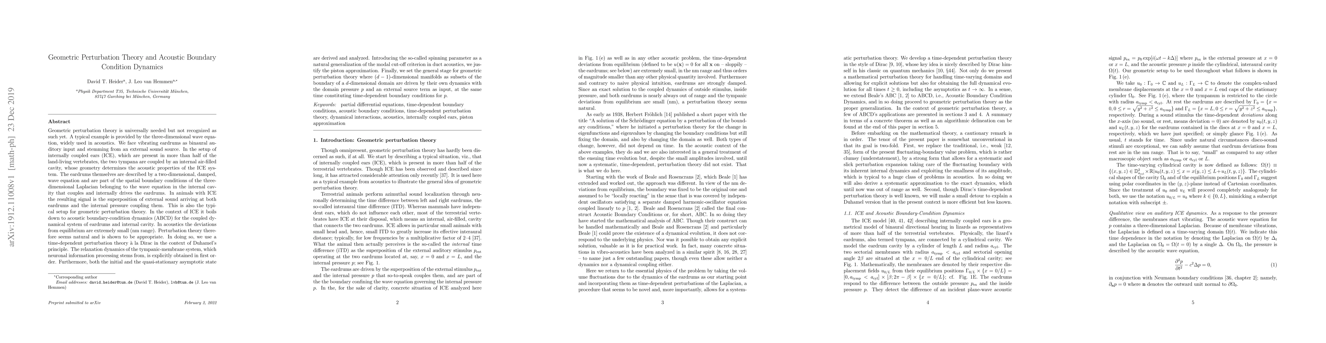 Geometric perturbation theory is universal. A typical example is provided by the 3D wave equation, widely used in acoustics. We face vibrating eardrums as a binaural auditory input stemming from an external sound source. In the setup of internally coupled ears (ICE), which are present in more than half of the land-living vertebrates, the two tympana are coupled by an internal air-filled cavity, whose geometry determines the acoustic properties of the ICE system. The eardrums themselves are described by a 2-dimensional, damped, wave equation and are part of the spatial boundary conditions of the three-dimensional Laplacian belonging to the wave equation in the internal cavity that couples and internally drives the eardrums. In animals with ICE the resulting signal is the superposition of external sound arriving at both eardrums and the internal pressure coupling them. This is also the typical setup for geometric perturbation theory. In the context of ICE it boils down to acoustic boundary-condition dynamics (ABCD) for the coupled dynamical system of eardrums and internal cavity. In acoustics the deviations from equilibrium are extremely small (nm). Perturbation theory is therefore natural and shown to be appropriate. In doing so, we use a time-dependent perturbation theory \`a la Dirac in the context of Duhamel's principle. The relaxation dynamics of the tympanic-membrane system, which neuronal information processing stems from, is explicitly obtained in first order. Furthermore, both the initial and the quasi-stationary asymptotic state are derived and analyzed. Finally, we set the general stage for geometric perturbation theory where (d-1)-dimensional manifolds as subsets of the boundary of a d-dimensional domain are driven by their own dynamics with the domain pressure $p$ and an external source term as input, at the same time constituting time-dependent boundary conditions for $p$.