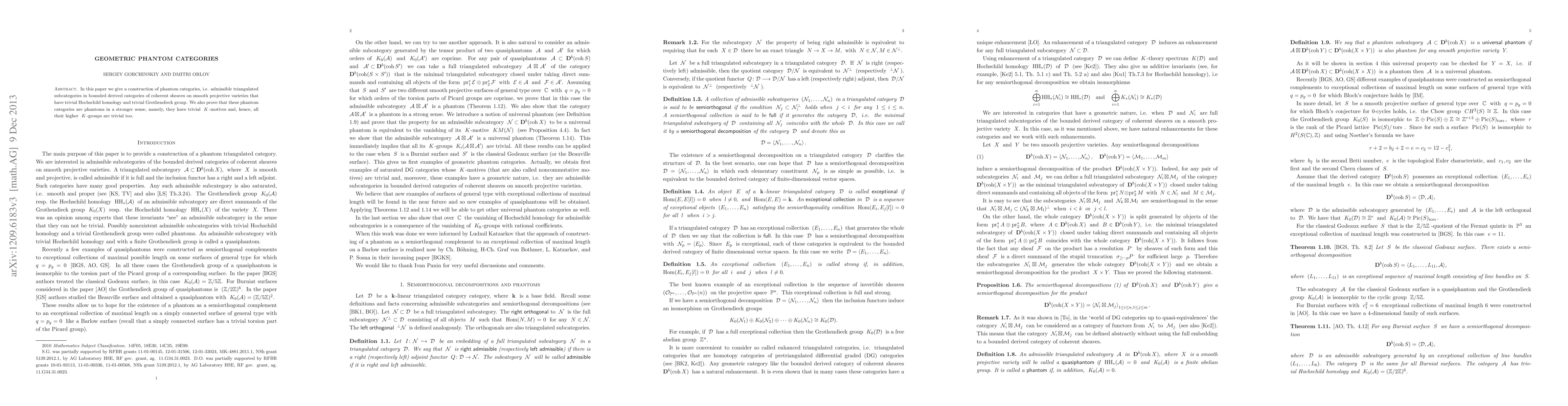 In this paper we give a construction of phantom categories, i.e. admissible triangulated subcategories in bounded derived categories of coherent sheaves on smooth projective varieties that have trivial Hochschild homology and trivial Grothendieck group. We also prove that these phantom categories are phantoms in a stronger sense, namely, they have trivial K-motives and, hence, all their higher K-groups are trivial too.