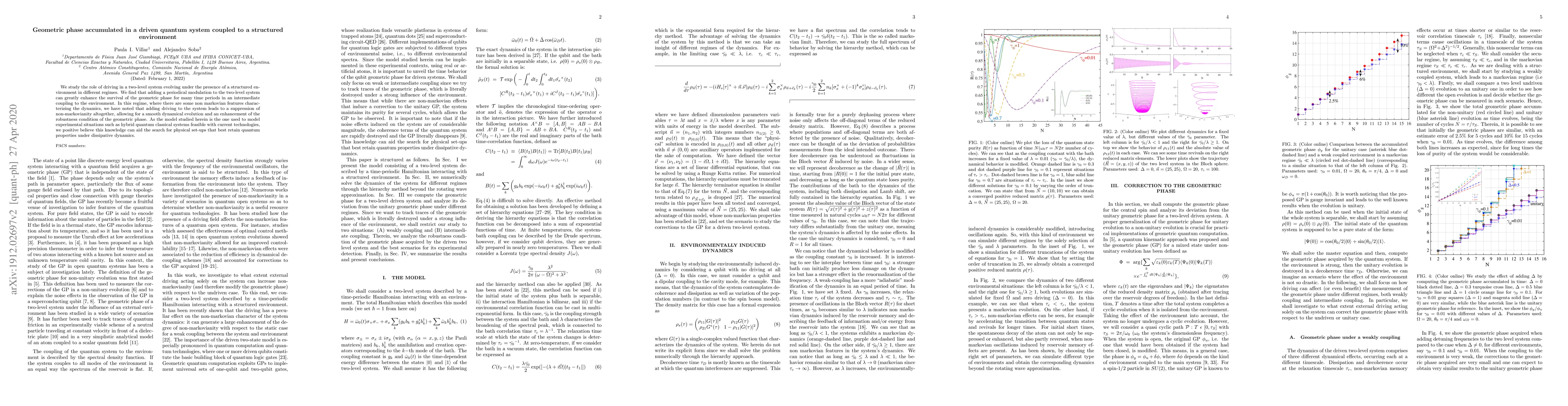 We study the role of driving in a two-level system evolving under the presence of a structured environment. We find that adding a periodical modulation to the two-level system can greatly enhance the survival of the geometric phase for many time periods. We show that this effect is mainly important for a markovian regimen but can still be found when the environment exhibits non-markovian behavior as time revivals. This knowledge can aid the search for physical set-ups that best retain quantum properties under dissipative dynamics.