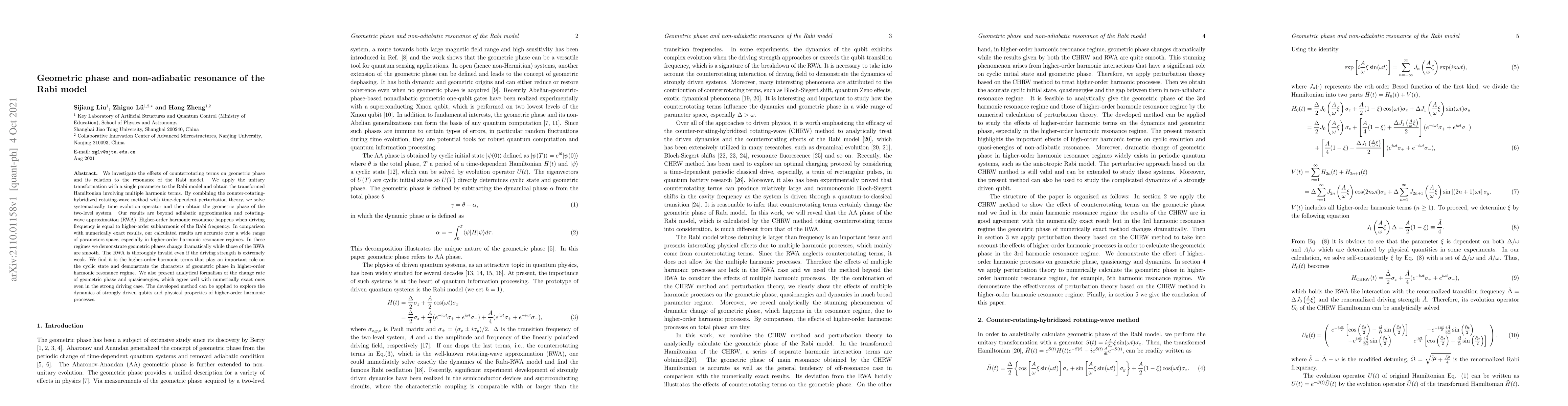 This paper explores the geometric phase and non-adiabatic resonance in the Rabi model, applying a unitary transformation to reveal the effects of counterrotating terms. It demonstrates significant geometric phase changes in higher-order harmonic resonance regimes, beyond the limitations of the rotating-wave approximation, and provides an accurate analytical method for these phenomena.