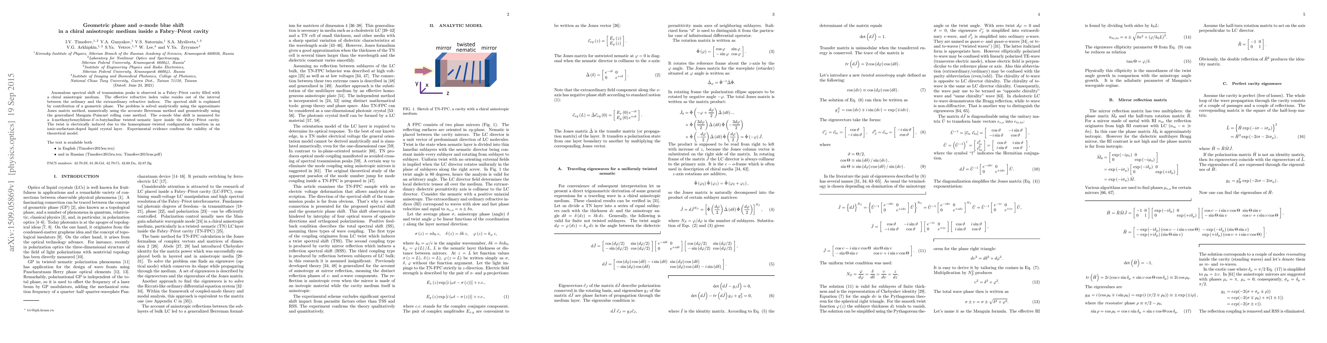 Anomalous spectral shift of transmission peaks is observed in a Fabry--P\'erot cavity filled with a chiral anisotropic medium. The effective refractive index value resides out of the interval between the ordinary and the extraordinary refractive indices. The spectral shift is explained by contribution of a geometric phase. The problem is solved analytically using the approximate Jones matrix method, numerically using the accurate Berreman method and geometrically using the generalized Mauguin--Poincar\'e rolling cone method. The $o$-mode blue shift is measured for a 4-methoxybenzylidene-4'-$n$-butylaniline twisted--nematic layer inside the Fabry--P\'erot cavity. The twist is electrically induced due to the homeoplanar--twisted configuration transition in an ionic-surfactant-doped liquid crystal layer. Experimental evidence confirms the validity of the theoretical model.