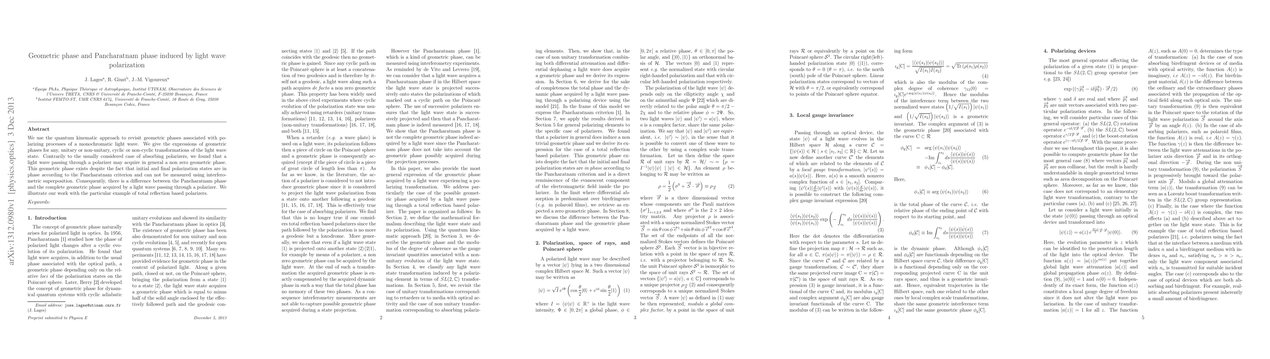 This paper revisits the geometric phases in light wave polarization using quantum kinematics, showing that light waves can acquire a non-zero geometric phase when passing through polarizers, despite being in phase according to the Pancharatnam criterion, thus distinguishing between the Pancharatnam phase and the complete geometric phase.