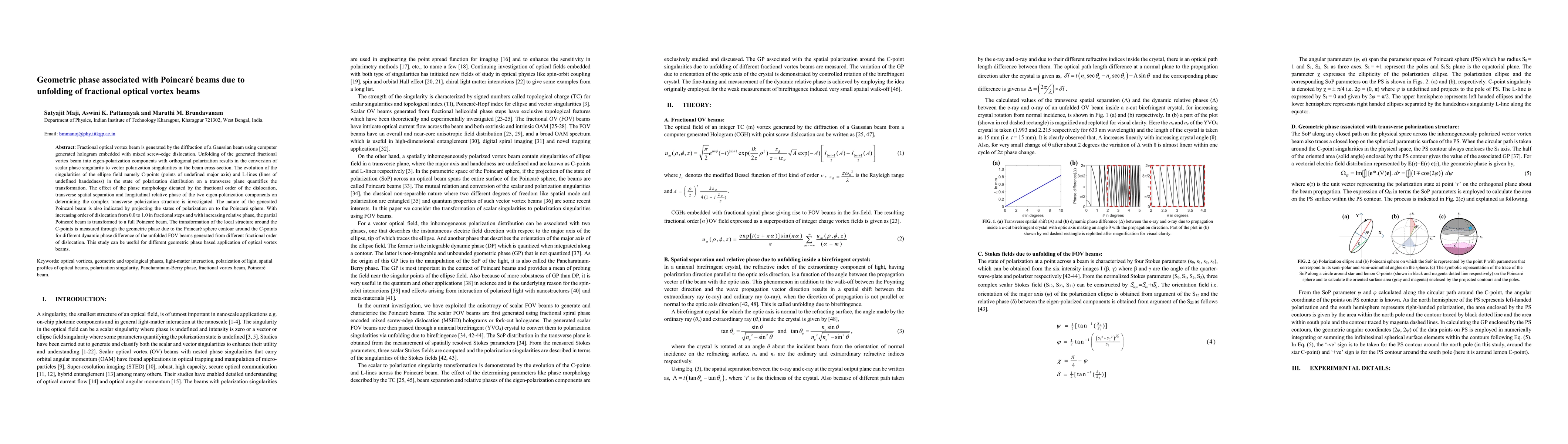 This paper investigates the geometric phase associated with Poincar\'e beams resulting from the unfolding of fractional optical vortex beams through birefringent crystals. The study reveals the transformation of scalar phase singularities into vector polarization singularities and quantifies the evolution of C-points and L-lines, highlighting the impact of dislocation order and phase separation on the transverse polarization structure.