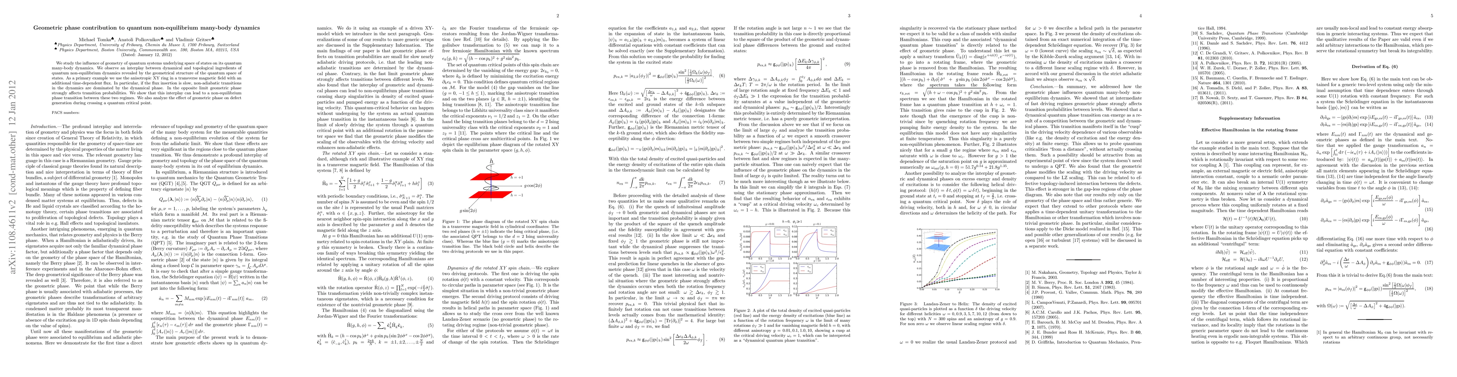 This paper investigates how geometric phases in quantum systems influence non-equilibrium many-body dynamics, particularly in the anisotropic XY ring model. It reveals a transition between dynamical and geometric phase dominance, leading to a non-equilibrium phase transition and affecting defect generation near quantum critical points.