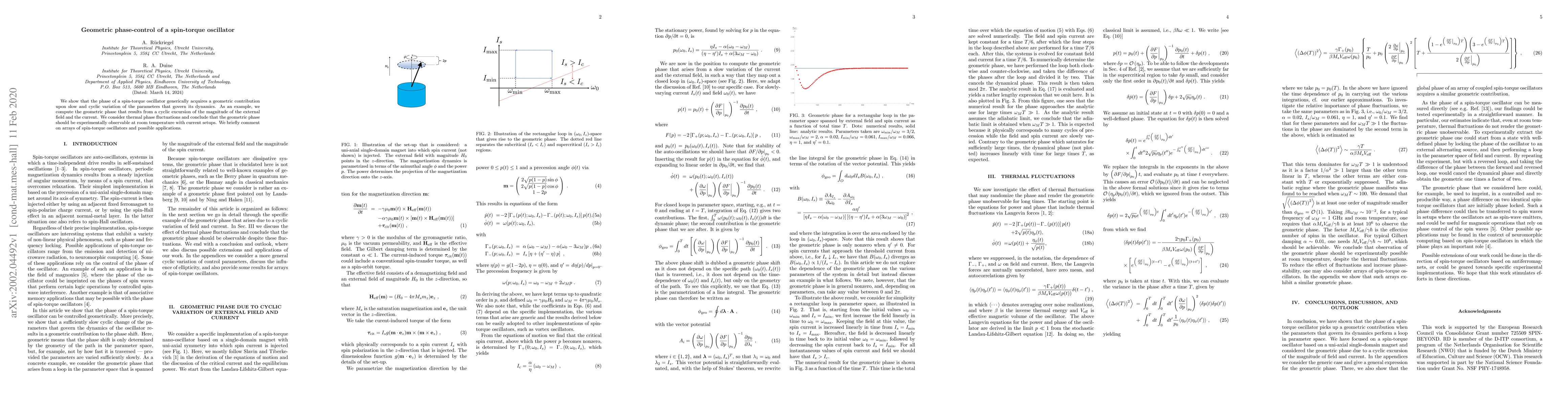 This paper demonstrates that spin-torque oscillators acquire a geometric phase during slow and cyclic parameter variations, such as changes in external field and current. The feasibility of observing this phase at room temperature is discussed, with implications for potential applications in arrays of oscillators.