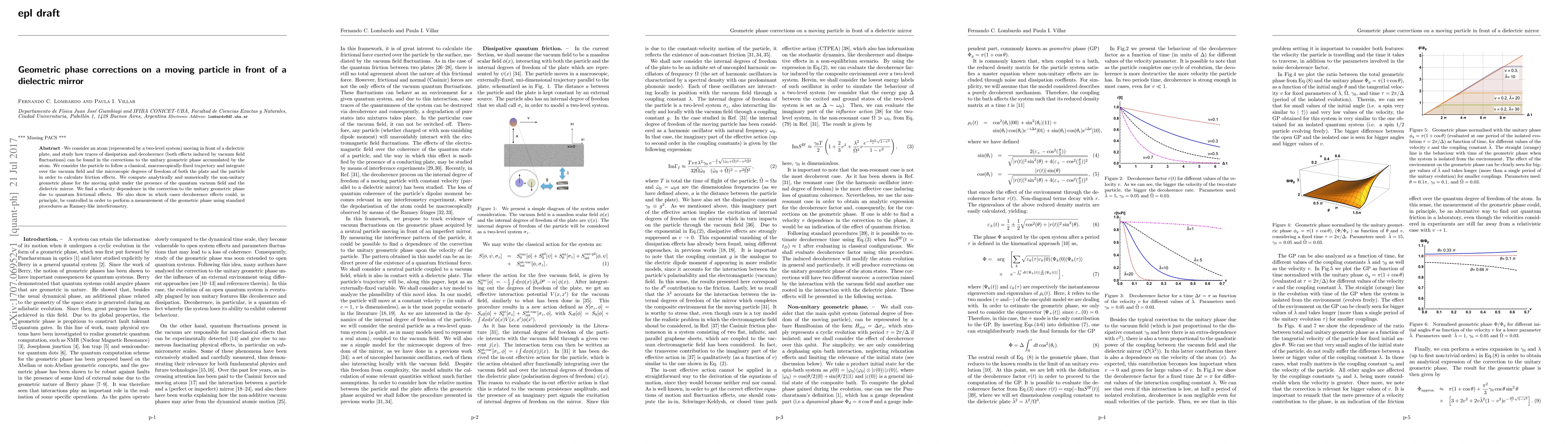 We consider an atom (represented by a two-level system) moving in front of a dielectric plate, and study how traces of dissipation and decoherence (both effects induced by vacuum field fluctuations) can be found in the corrections to the unitary geometric phase accumulated by the atom. We consider the particle to follow a classical, macroscopically-fixed trajectory and integrate over the vacuum field and the microscopic degrees of freedom of both the plate and the particle in order to calculate friction effects. We compute analytically and numerically the non-unitary geometric phase for the moving qubit under the presence of the quantum vacuum field and the dielectric mirror. We find a velocity dependence in the correction to the unitary geometric phase due to quantum frictional effects. We also show in which cases decoherence effects could, in principle, be controlled in order to perform a measurement of the geometric phase using standard procedures as Ramsey-like interferometry.