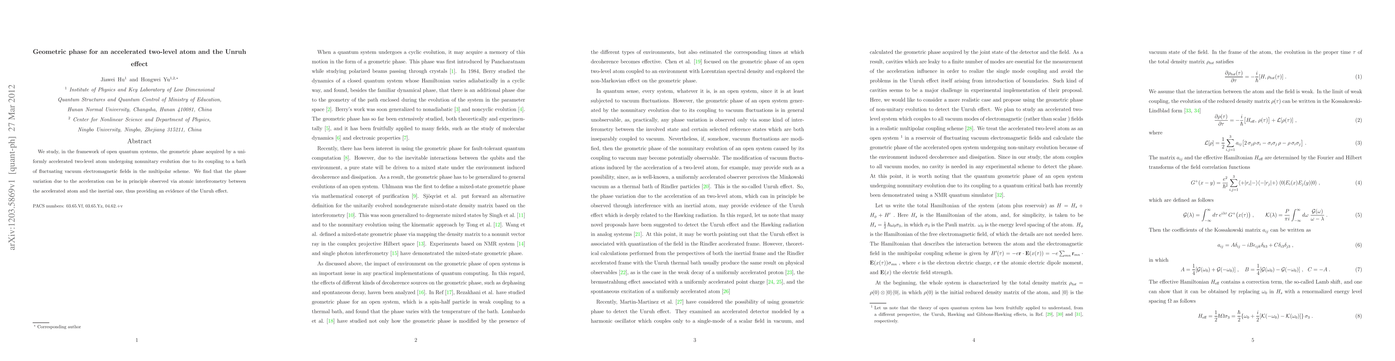 This paper investigates the geometric phase in an accelerated two-level atom interacting with fluctuating vacuum electromagnetic fields, revealing a phase variation attributable to acceleration. The study suggests that this effect could be detected via atomic interferometry, offering evidence of the Unruh effect.