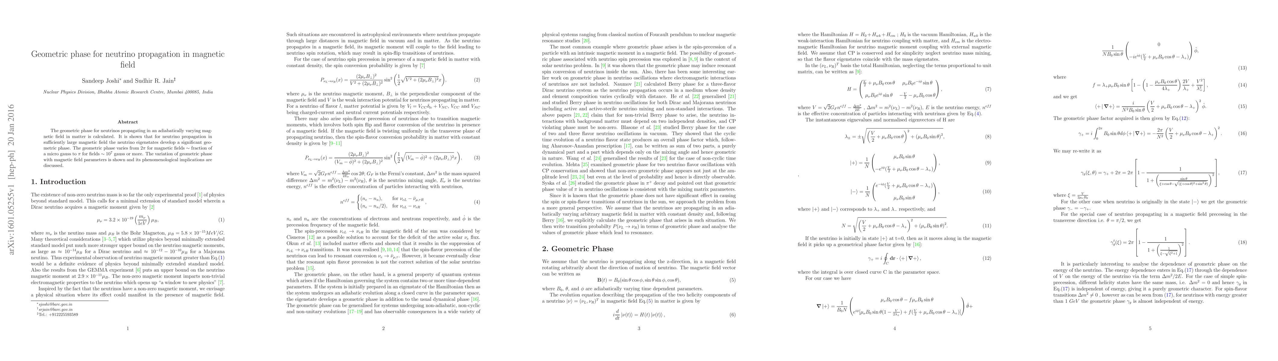 This paper calculates the geometric phase for neutrino propagation in an adiabatically varying magnetic field, revealing significant geometric phase development in large magnetic fields. The geometric phase varies from 2π in fields of a fraction of a micro gauss to π in fields of 10^7 gauss or more, with implications for neutrino dynamics in magnetic environments.
