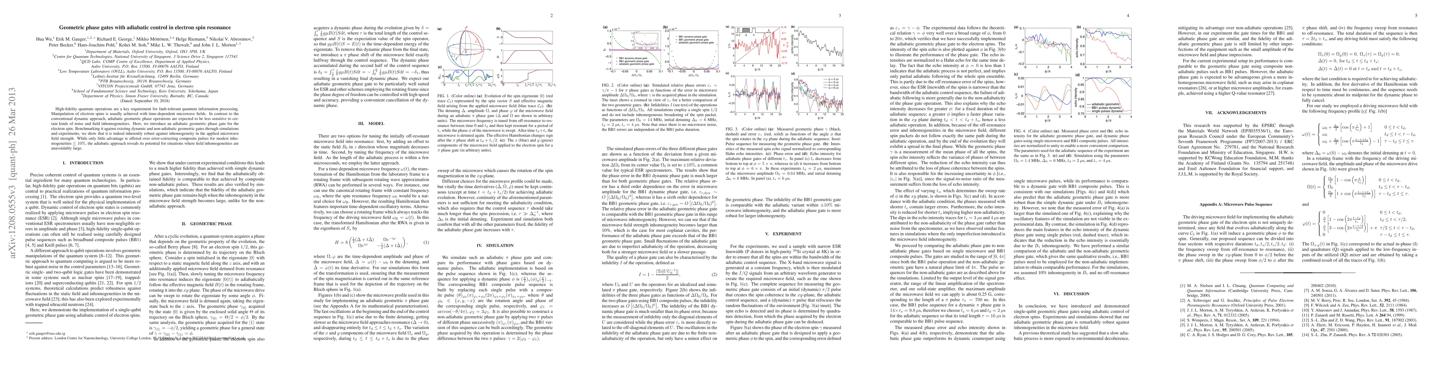 This paper explores the use of adiabatic geometric phase gates in electron spin resonance for high-fidelity quantum operations, demonstrating their robustness against microwave field inhomogeneities through simulations and experiments. While offering limited benefits for small inhomogeneities, the adiabatic approach shows significant potential in scenarios with larger field imperfections.