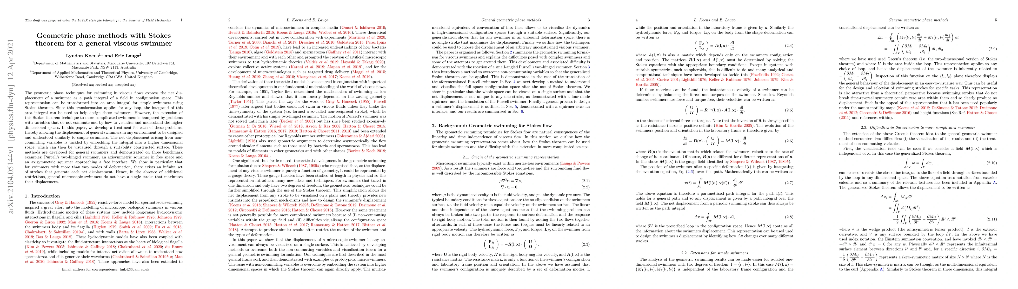 Researchers develop methods to design and analyze displacement of general swimmers in viscous flows using geometric phase techniques and Stokes theorem, revealing that these swimmers have infinite sets of strokes generating each net displacement.