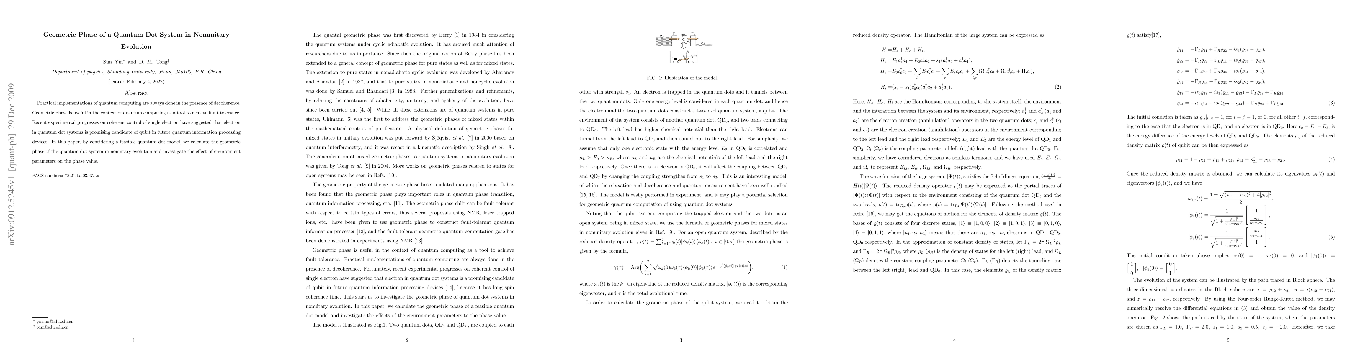 This paper calculates the geometric phase in a quantum dot system undergoing nonunitary evolution, highlighting its potential role in fault tolerance for quantum computing. It examines how environmental parameters influence the phase value, suggesting quantum dot systems as promising qubits for future quantum information processing.