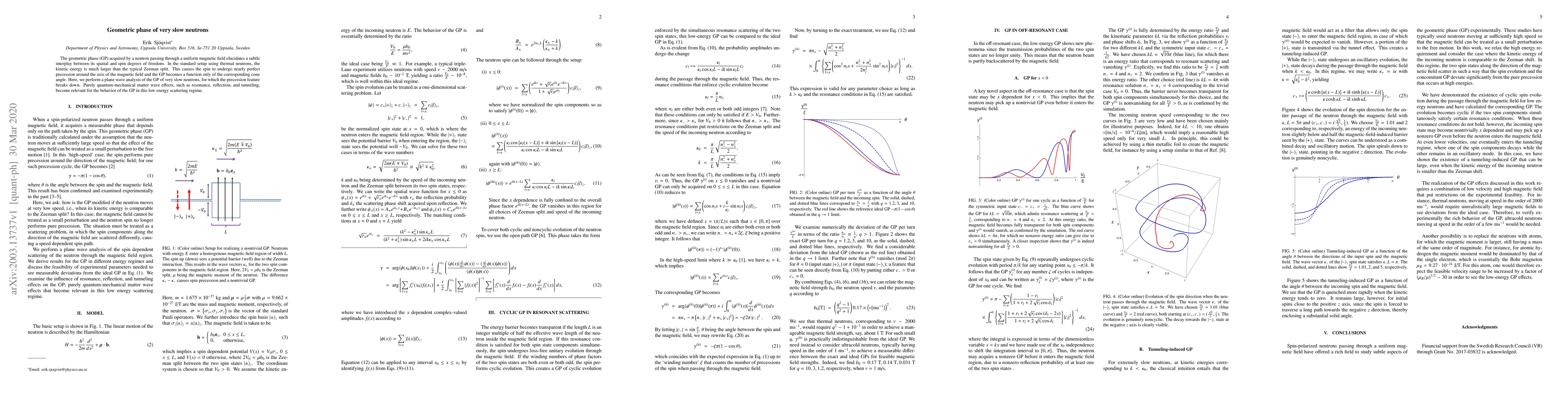 The geometric phase (GP) acquired by a neutron passing through a uniform magnetic field elucidates a subtle interplay between its spatial and spin degrees of freedom. In the standard setup using thermal neutrons, the kinetic energy is much larger than the typical Zeeman split. This causes the spin to undergo nearly perfect precession around the axis of the magnetic field and the GP becomes a function only of the corresponding cone angle. Here, we perform a plane wave analysis of the GP of very slow neutrons, for which the precession feature breaks down. Purely quantum-mechanical matter wave effects, such as resonance, reflection, and tunneling, become relevant for the behavior of the GP in this low energy scattering regime.