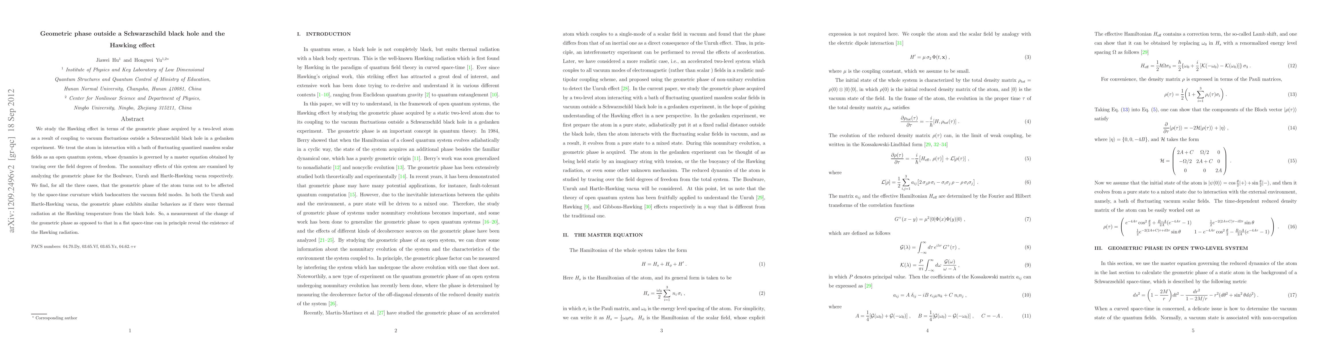 We study the Hawking effect in terms of the geometric phase acquired by a two-level atom as a result of coupling to vacuum fluctuations outside a Schwarzschild black hole in a gedanken experiment. We treat the atom in interaction with a bath of fluctuating quantized massless scalar fields as an open quantum system, whose dynamics is governed by a master equation obtained by tracing over the field degrees of freedom. The nonunitary effects of this system are examined by analyzing the geometric phase for the Boulware, Unruh and Hartle-Hawking vacua respectively. We find, for all the three cases, that the geometric phase of the atom turns out to be affected by the space-time curvature which backscatters the vacuum field modes. In both the Unruh and Hartle-Hawking vacua, the geometric phase exhibits similar behaviors as if there were thermal radiation at the Hawking temperature from the black hole. So, a measurement of the change of the geometric phase as opposed to that in a flat space-time can in principle reveal the existence of the Hawking radiation.
