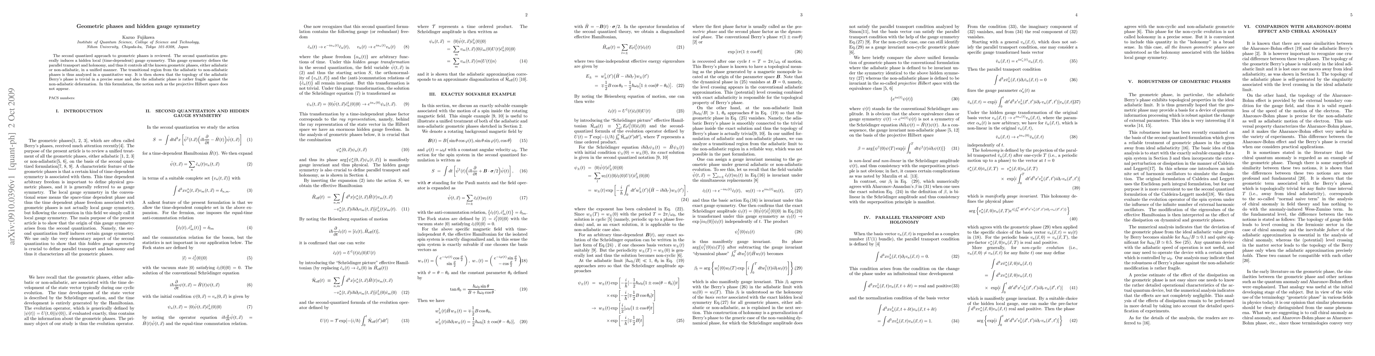 The second quantized approach to geometric phases is reviewed. The second quantization generally induces a hidden local (time-dependent) gauge symmetry. This gauge symmetry defines the parallel transport and holonomy, and thus it controls all the known geometric phases, either adiabatic or non-adiabatic, in a unified manner. The transitional region from the adiabatic to non-adiabatic phases is thus analyzed in a quantitative way. It is then shown that the topology of the adiabatic Berry's phase is trivial in a precise sense and also the adiabatic phase is rather fragile against the non-adiabatic deformation. In this formulation, the notion such as the projective Hilbert space does not appear.