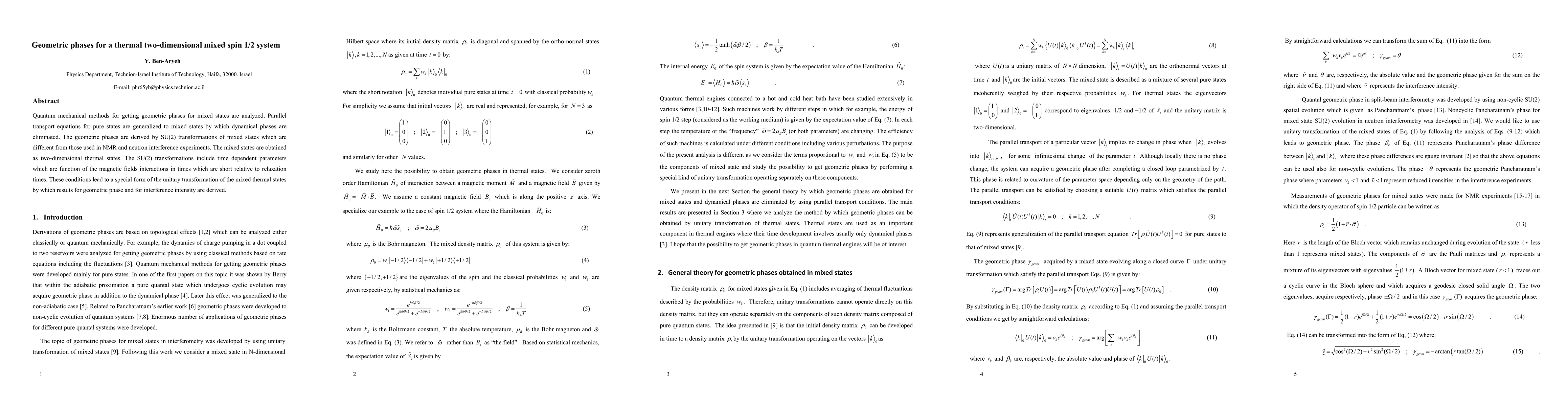 This paper analyzes quantum mechanical methods to derive geometric phases for mixed thermal spin 1/2 systems, generalizing parallel transport equations for pure states to mixed states. It derives the geometric phases as Pancharatnam phases, using SU(2) transformations distinct from those in NMR and neutron experiments, under high-order perturbations of oscillating magnetic fields.