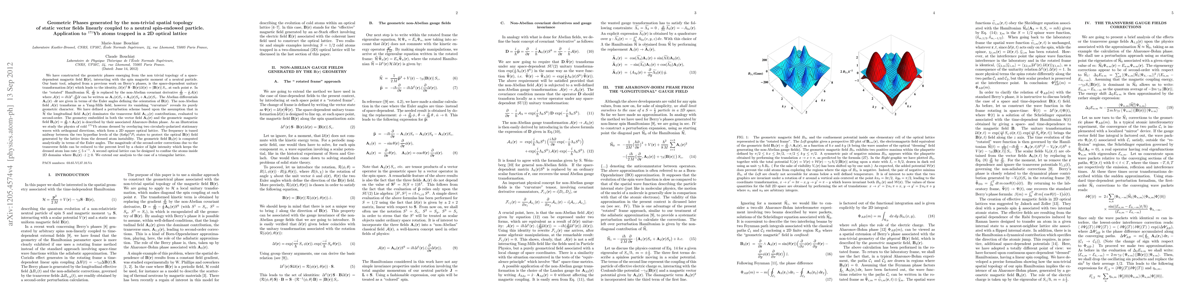 We have constructed the geometric phases emerging from the non-trivial topology of a space-dependent magnetic field, interacting with the spin magnetic moment of a neutral particle. Our basic tool is the local unitary transformation which recasts the magnetic spin interaction under a diagonal form. Rewriting the kinetic term in the "rotated" frame requires the introduction of non-Abelian covariant derivatives, involving the gradients of the Euler angles which define the orientation of the local field. Within the rotated frame, we have built a perturbation scheme,assuming that the longitudinal non-Abelian field component dominates the transverse ones, to be evaluated to second-order. The geometry embedded in the longitudinal gauge vector field and its curl, the geometric magnetic field, is described by the associated Aharonov-Bohm phase. As an illustration, we study the physics of cold 171Yb atoms dressed by two sets of circularly polarized beams, forming square or triangular 2D optical lattices. The geometric field is computed explicitly from the Euler angles. The magnitude of 2nd-order corrections due to transverse fields can be reduced to the percent level by a choice of light intensity which keeps the dressed atom loss rate below 5 s^{-1}. An auxiliary optical lattice confines the atoms within 2D domains where the geometric field is pointing upward.