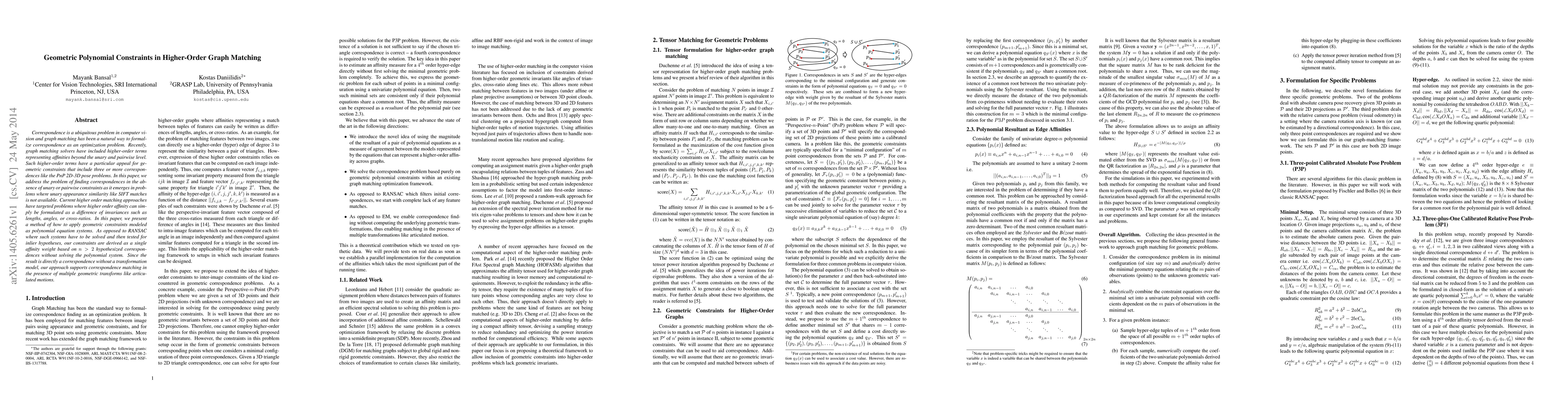 Researchers present a new method for solving higher-order graph matching problems with geometric constraints, focusing on cases without unary or pairwise constraints. Their approach leverages polynomial equation systems to find correspondences directly from hypothesized transforms.