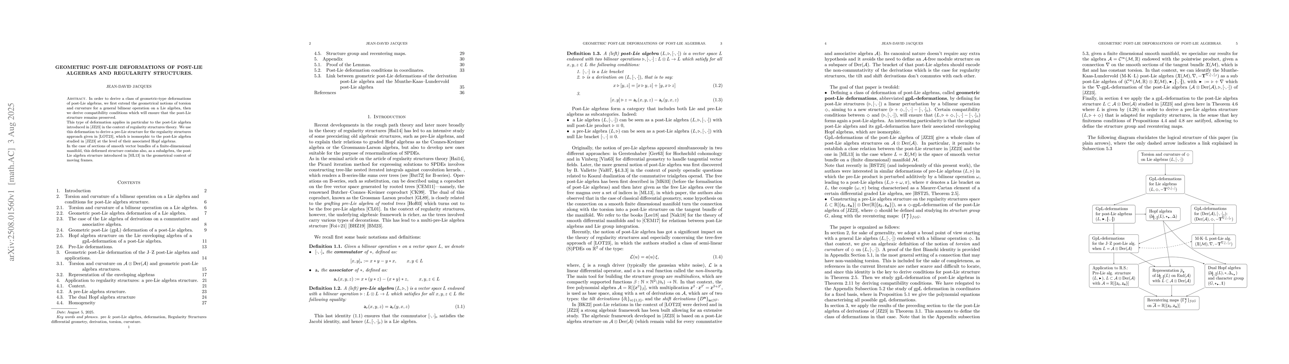In order to derive a class of geometric-type deformations of post-Lie algebras, we first extend the geometrical notions of torsion and curvature for a general bilinear operation on a Lie algebra, then we derive compatibility conditions which will ensure that the post-Lie structure remains preserved. This type of deformation applies in particular to the post-Lie algebra introduced in arXiv:2306.02484v3 in the context of regularity structures theory. We use this deformation to derive a pre-Lie structure for the regularity structures approach given in arXiv:2103.04187v4, which is isomorphic to the post-Lie algebra studied in arXiv:2306.02484v3 at the level of their associated Hopf algebras. In the case of sections of smooth vector bundles of a finite-dimensional manifold, this deformed structure contains also, as a subalgebra, the post-Lie algebra structure introduced in arXiv:1203.4738v3 in the geometrical context of moving frames.