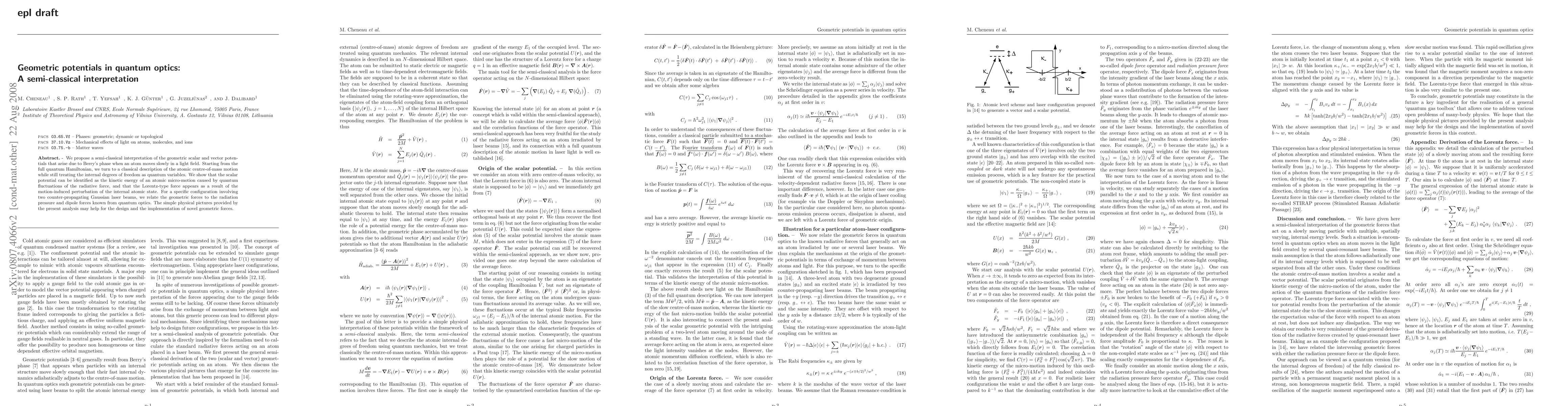 We propose a semi-classical interpretation of the geometric scalar and vector potentials that arise due to Berry's phase when an atom moves slowly in a light field. Starting from the full quantum Hamiltonian, we turn to a classical description of the atomic centre-of-mass motion while still treating the internal degrees of freedom as quantum variables. We show that the scalar potential can be identified as the kinetic energy of an atomic micro-motion caused by quantum fluctuations of the radiative force, and that the Lorentz-type force appears as a result of the motion-induced perturbation of the internal atomic state. For a specific configuration involving two counter-propagating Gaussian laser beams, we relate the geometric forces to the radiation pressure and dipole forces known from quantum optics. The simple physical pictures provided by the present analysis may help for the design and the implementation of novel geometric forces.