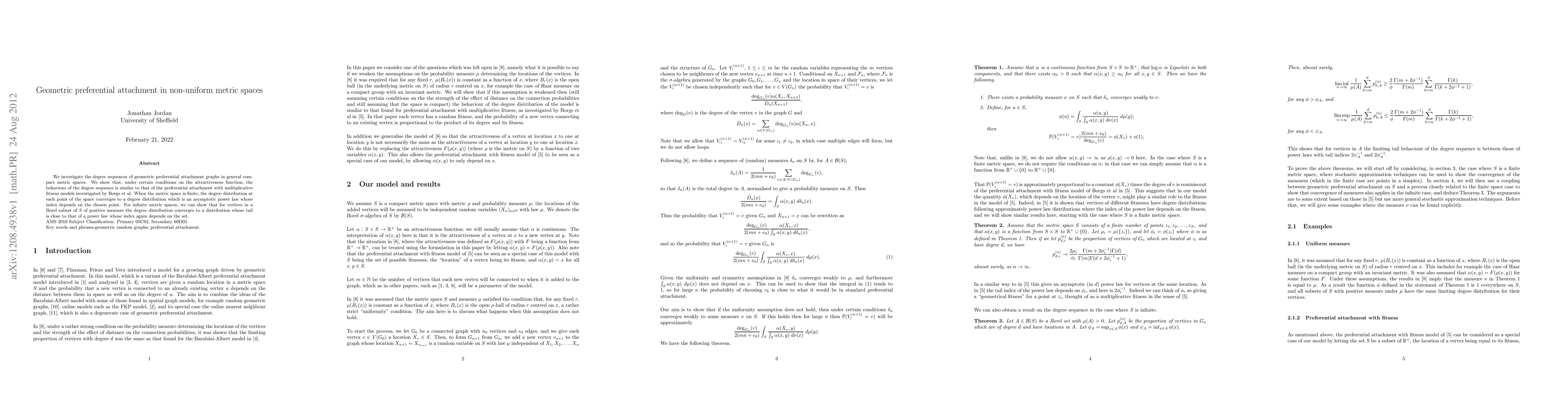 We investigate the degree sequences of geometric preferential attachment graphs in general compact metric spaces. We show that, under certain conditions on the attractiveness function, the behaviour of the degree sequence is similar to that of the preferential attachment with multiplicative fitness models investigated by Borgs et al. When the metric space is finite, the degree distribution at each point of the space converges to a degree distribution which is an asymptotic power law whose index depends on the chosen point. For infinite metric spaces, we can show that for vertices in a Borel subset of $S$ of positive measure the degree distribution converges to a distribution whose tail is close to that of a power law whose index again depends on the set.
