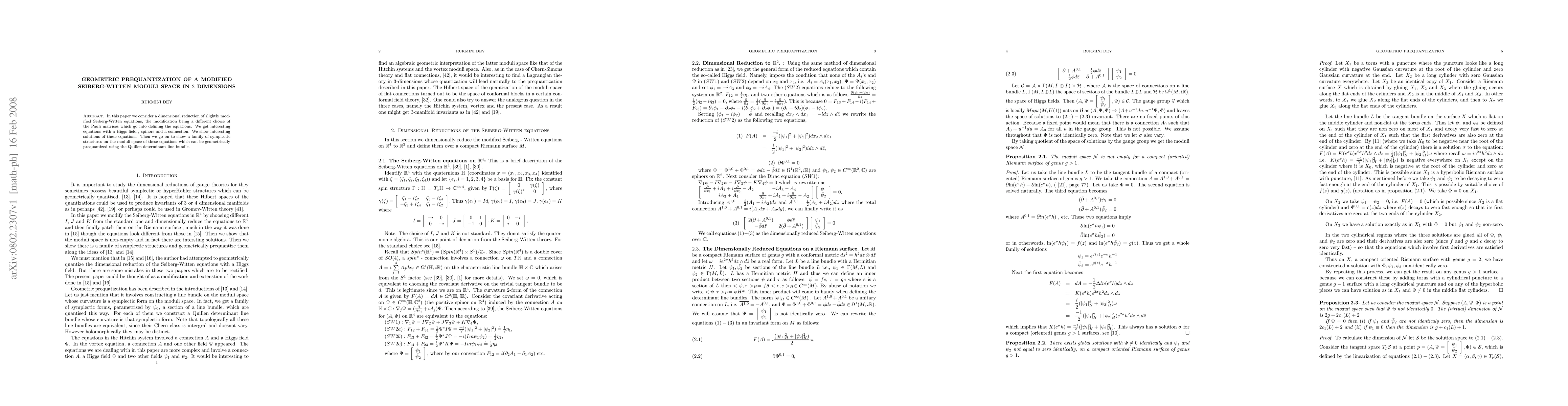In this paper we consider a dimensional reduction of slightly modified Seiberg-Witten equations, the modification being a different choice of the Pauli matrices which go into defining the equations. We get interesting equations with a Higgs field, spinors and a connection. We show interesting solutions of these equations. Then we go on to show a family of symplectic structures on the moduli space of these equations which can be geometrically prequantized using the Quillen determinant line bundle.