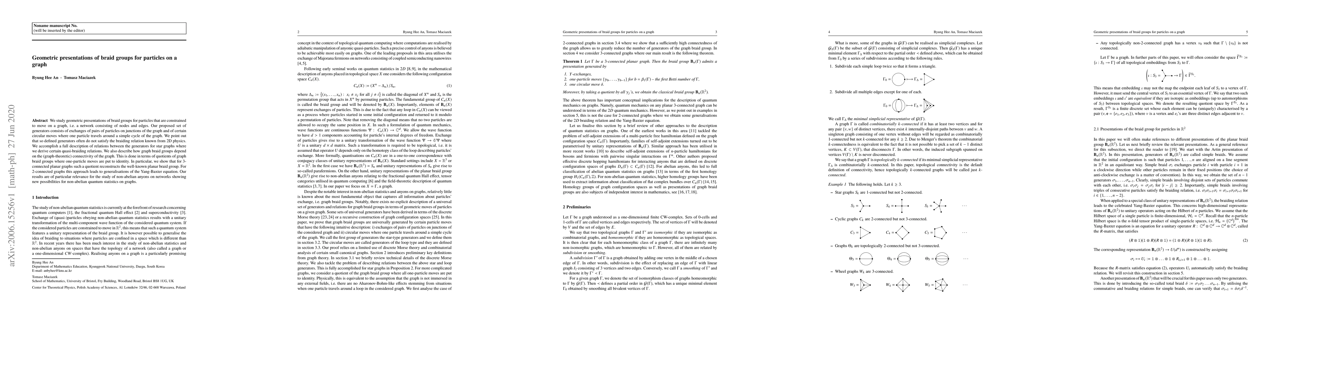 This paper explores geometric presentations of braid groups for particles constrained to move on graphs, proposing a set of generators involving particle exchanges and circular moves. It derives quasi-braiding relations for star graphs and shows how graph braid groups relate to graph connectivity, particularly reconstructing the planar braid group for 3-connected planar graphs and generalizing the Yang-Baxter equation for 2-connected graphs.