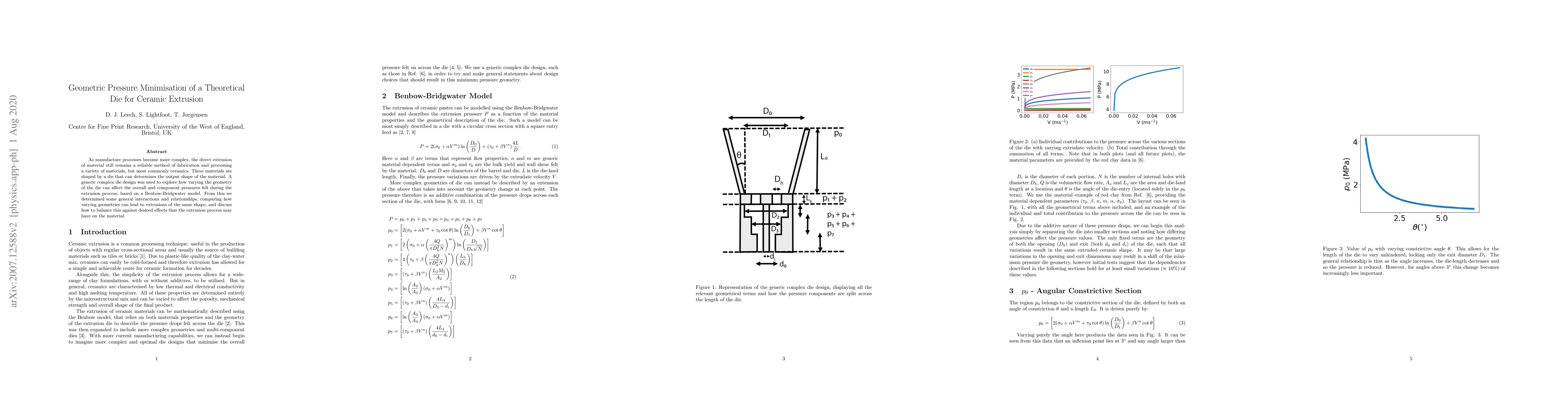 This paper investigates the geometric pressure minimization of a die for ceramic extrusion, using a generic complex die design to explore how die geometry affects extrusion pressures. The study finds relationships between die geometry variations and resultant pressures, aiming to balance the extrusion process with desired material effects.