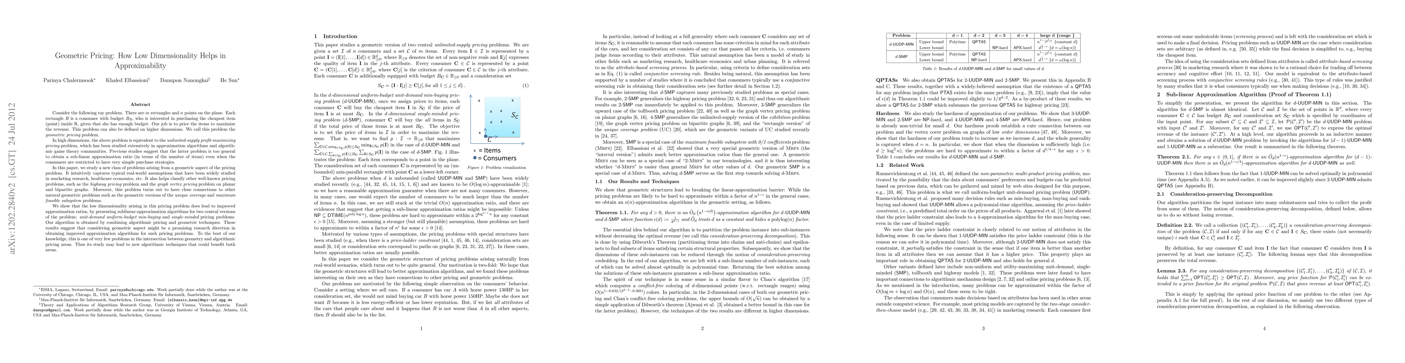 Consider the following toy problem. There are $m$ rectangles and $n$ points on the plane. Each rectangle $R$ is a consumer with budget $B_R$, who is interested in purchasing the cheapest item (point) inside R, given that she has enough budget. Our job is to price the items to maximize the revenue. This problem can also be defined on higher dimensions. We call this problem the geometric pricing problem. In this paper, we study a new class of problems arising from a geometric aspect of the pricing problem. It intuitively captures typical real-world assumptions that have been widely studied in marketing research, healthcare economics, etc. It also helps classify other well-known pricing problems, such as the highway pricing problem and the graph vertex pricing problem on planar and bipartite graphs. Moreover, this problem turns out to have close connections to other natural geometric problems such as the geometric versions of the unique coverage and maximum feasible subsystem problems. We show that the low dimensionality arising in this pricing problem does lead to improved approximation ratios, by presenting sublinear-approximation algorithms for two central versions of the problem: unit-demand uniform-budget min-buying and single-minded pricing problems. Our algorithm is obtained by combining algorithmic pricing and geometric techniques. These results suggest that considering geometric aspect might be a promising research direction in obtaining improved approximation algorithms for such pricing problems. To the best of our knowledge, this is one of very few problems in the intersection between geometry and algorithmic pricing areas. Thus its study may lead to new algorithmic techniques that could benefit both areas.