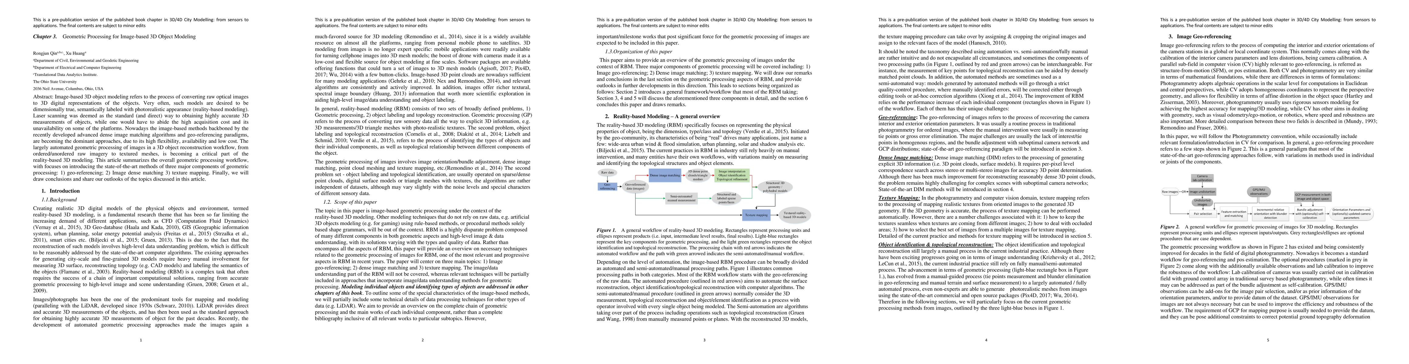 Image-based 3D object modeling refers to the process of converting raw optical images to 3D digital representations of the objects. Very often, such models are desired to be dimensionally true, semantically labeled with photorealistic appearance (reality-based modeling). Laser scanning was deemed as the standard (and direct) way to obtaining highly accurate 3D measurements of objects, while one would have to abide the high acquisition cost and its unavailability on some of the platforms. Nowadays the image-based methods backboned by the recently developed advanced dense image matching algorithms and geo-referencing paradigms, are becoming the dominant approaches, due to its high flexibility, availability and low cost. The largely automated geometric processing of images in a 3D object reconstruction workflow, from ordered/unordered raw imagery to textured meshes, is becoming a critical part of the reality-based 3D modeling. This article summarizes the overall geometric processing workflow, with focuses on introducing the state-of-the-art methods of three major components of geometric processing: 1) geo-referencing; 2) Image dense matching 3) texture mapping. Finally, we will draw conclusions and share our outlooks of the topics discussed in this article.