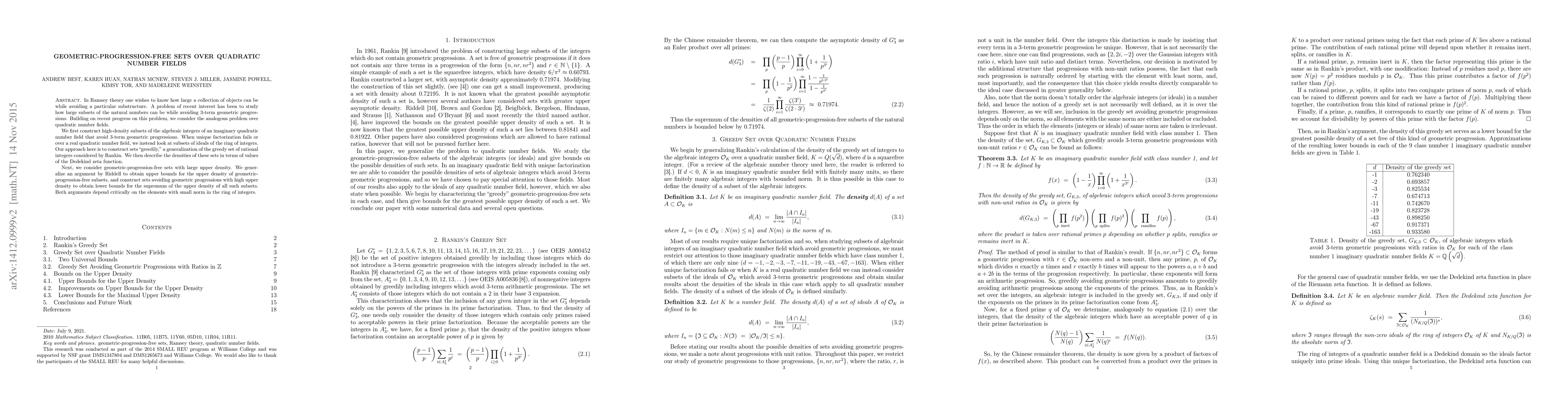 A problem of recent interest has been to study how large subsets of the natural numbers can be while avoiding 3-term geometric progressions. Building on recent progress on this problem, we consider the analogous problem over quadratic number fields. We first construct high-density subsets of the algebraic integers of an imaginary quadratic number field that avoid 3-term geometric progressions. When unique factorization fails or over a real quadratic number field, we instead look at subsets of ideals of the ring of integers. Our approach here is to construct sets "greedily," a generalization of the greedy set of rational integers considered by Rankin. We then describe the densities of these sets in terms of values of the Dedekind zeta function. Next, we consider geometric-progression-free sets with large upper density. We generalize an argument by Riddell to obtain upper bounds for the upper density of geometric-progression-free subsets, and construct sets avoiding geometric progressions with high upper density to obtain lower bounds for the supremum of the upper density of all such subsets. Both arguments depend critically on the elements with small norm in the ring of integers.