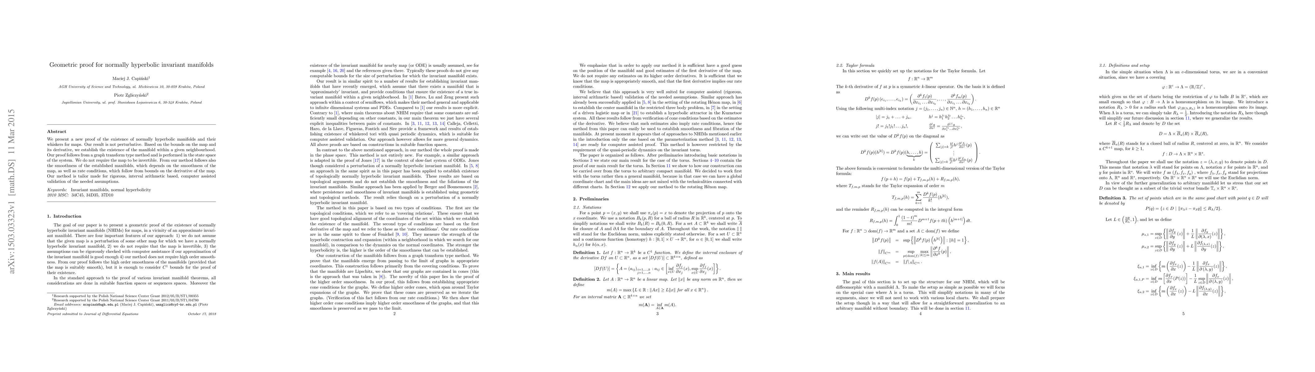 This paper introduces a new geometric proof for normally hyperbolic invariant manifolds without relying on perturbation methods. It establishes the existence of these manifolds and their whiskers based on bounds on the map and its derivative, ensuring their smoothness and rate conditions. The proof employs a graph transform technique and supports rigorous, computer-assisted validation.