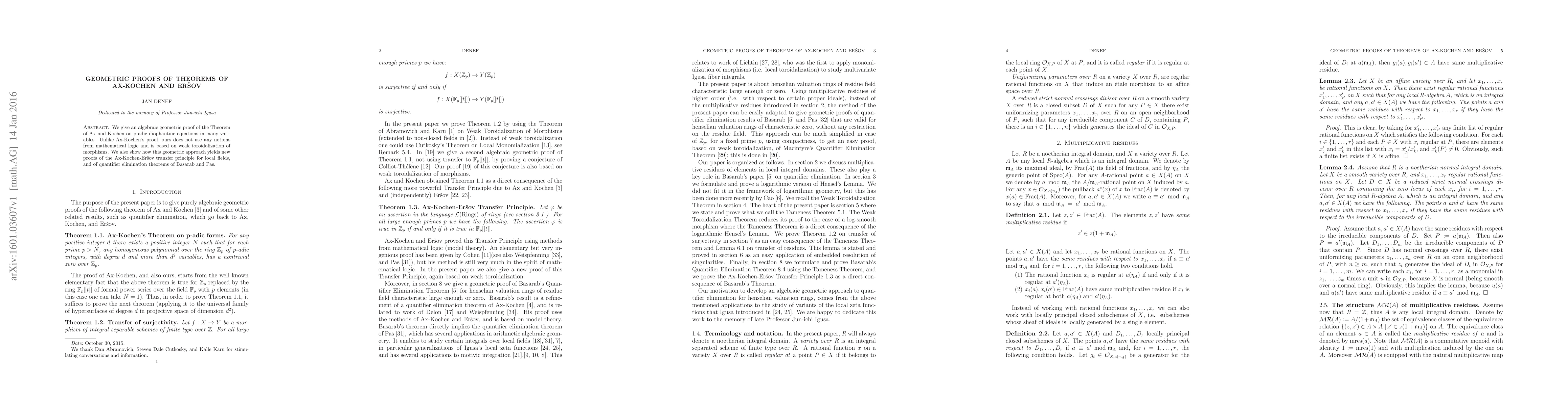 This paper presents an algebraic geometric proof for Ax-Kochen's theorem on p-adic Diophantine equations, relying on weak toroidalization instead of mathematical logic. Additionally, it provides new geometric proofs for the Ax-Kochen-Ersov transfer principle and Basarab's quantifier elimination theorems.