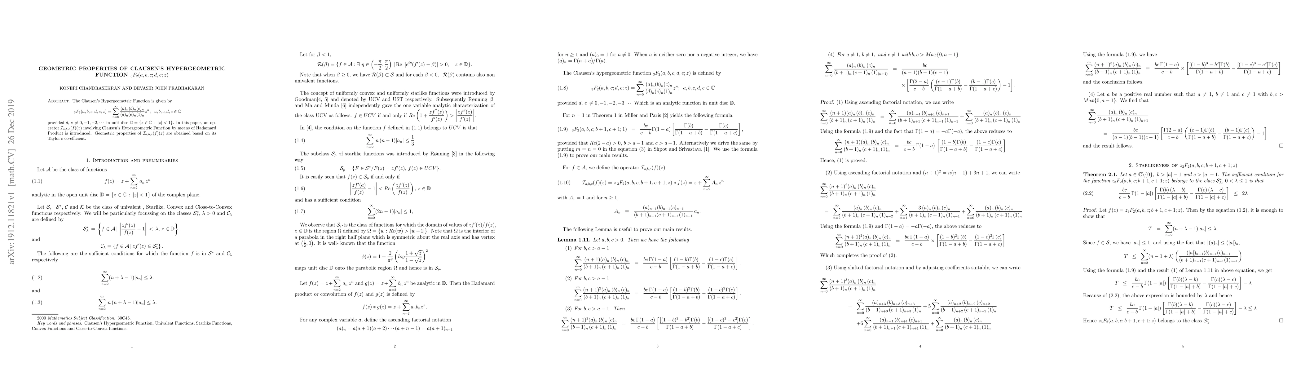 The Clausen's Hypergeometric Function is given by $${}_3F_2(a,b,c;d,e;z) = \sum_{n=0}^\infty \frac{(a)_n(b)_n(c)_n}{(d)_n(e)_n(1)_n}z^n\, ; \ a,b,c,d,e\in \mathbb{C}$$ provided $d,\, e\, \neq 0,-1,-2,\cdots$ in unit disc $\mathbb{D} =\{z\in \mathbb{C} \,:\, |z|<1\}$. In this paper, an operator $\mathcal{I}_{a,b,c}(f)(z)$ involving Clausen's Hypergeometric Function by means of Hadamard Product is introduced. Geometric properties of $\mathcal{I}_{a,b,c}(f)(z)$ are obtained based on its Taylor's coefficient.