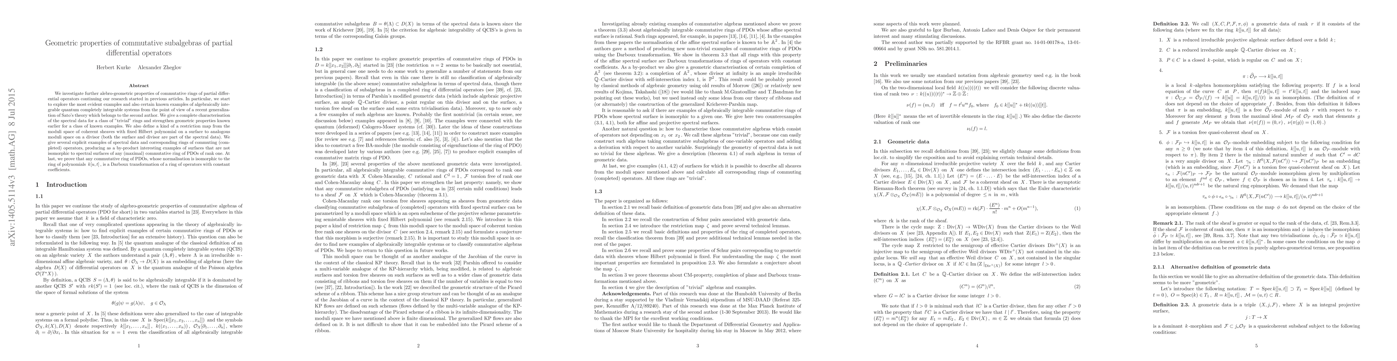We investigate further alebro-geometric properties of commutative rings of partial differential operators continuing our research started in previous articles. In particular, we start to explore the most evident examples and also certain known examples of algebraically integrable quantum completely integrable systems from the point of view of a recent generalization of Sato's theory which belongs to the second author. We give a complete characterisation of the spectral data for a class of "trivial" rings and strengthen geometric properties known earlier for a class of known examples. We also define a kind of a restriction map from the moduli space of coherent sheaves with fixed Hilbert polynomial on a surface to analogous moduli space on a divisor (both the surface and divisor are part of the spectral data). We give several explicit examples of spectral data and corresponding rings of commuting (completed) operators, producing as a by-product interesting examples of surfaces that are not isomorphic to spectral surfaces of any commutative ring of PDOs of rank one. At last, we prove that any commutative ring of PDOs, whose normalisation is isomorphic to the ring of polynomials $k[u,t]$, is a Darboux transformation of a ring of operators with constant coefficients.