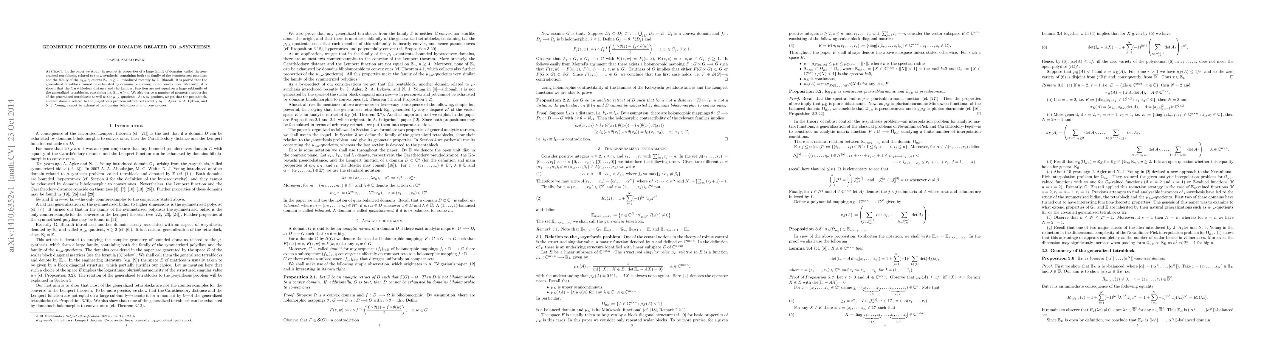 This paper investigates the geometric properties of generalized tetrablocks, domains related to $\mu$-synthesis, proving they cannot be exhausted by biholomorphic convex domains and showing inequality between the Carathéodory distance and Lempert function for a significant subfamily.