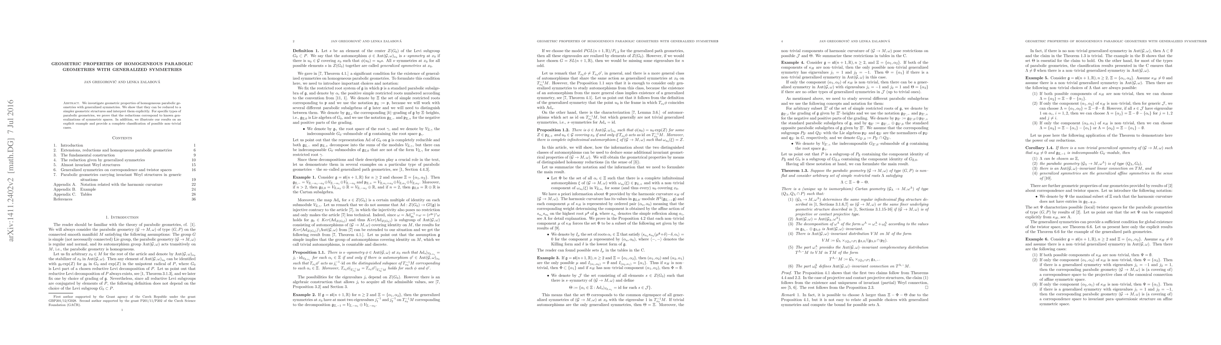 This paper explores the geometric properties of homogeneous parabolic geometries with generalized symmetries, demonstrating that they can be simplified and explicitly interpreted. It also classifies non-trivial cases and shows reductions correspond to known generalizations of symmetric spaces through an explicit example.