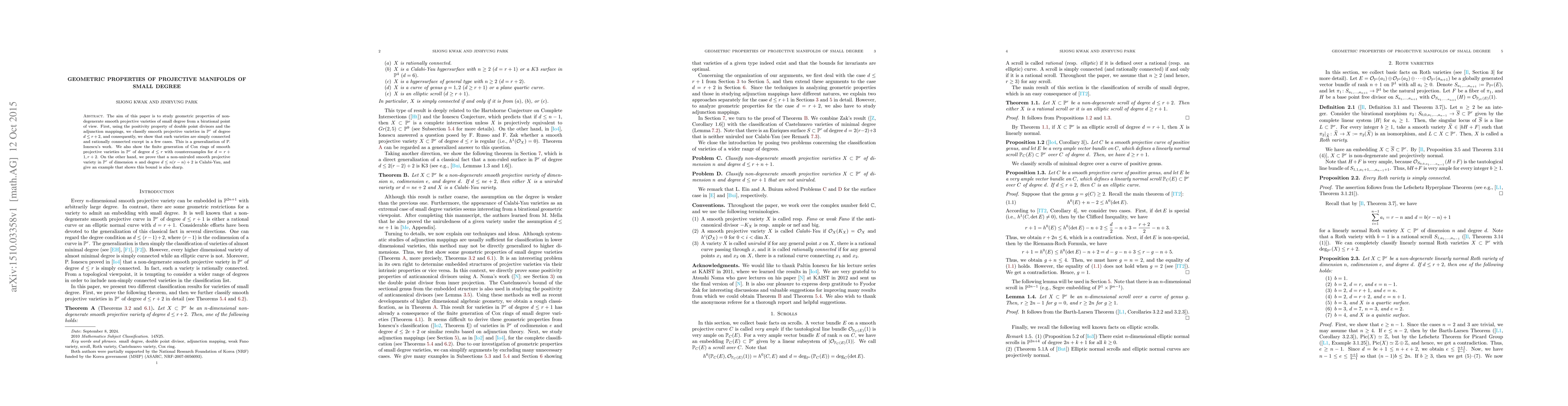 The aim of this paper is to study geometric properties of non-degenerate smooth projective varieties of small degree from a birational point of view. First, using the positivity property of double point divisors and the adjunction mappings, we classify smooth projective varieties in $\mathbb P^r$ of degree $d \leq r+2$, and consequently, we show that such varieties are simply connected and rationally connected except in a few cases. This is a generalization of P. Ionescu's work. We also show the finite generation of Cox rings of smooth projective varieties in $\mathbb P^r$ of degree $d \leq r$ with counterexamples for $d=r+1, r+2$. On the other hand, we prove that a non-uniruled smooth projective variety in $\mathbb P^r$ of dimension $n$ and degree $d \leq n(r-n)+2$ is Calabi-Yau, and give an example that shows this bound is also sharp.