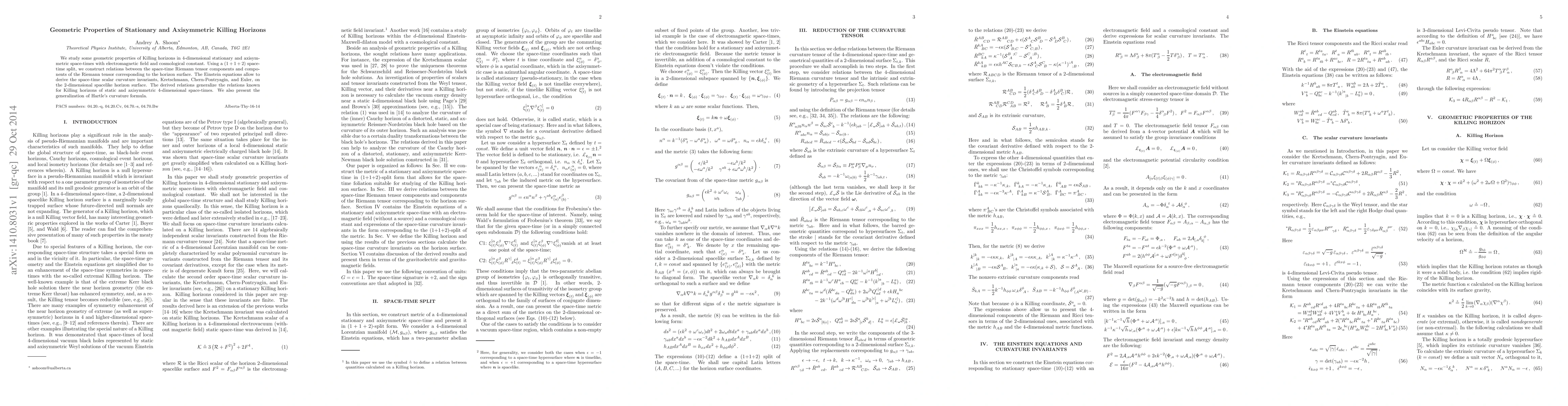 This paper investigates the geometric properties of Killing horizons in 4D stationary and axisymmetric space-times, deriving relations between the space-time Riemann tensor and the horizon's Riemann tensor. It generalizes known relations for static and axisymmetric space-times and extends Hartle's curvature formula.