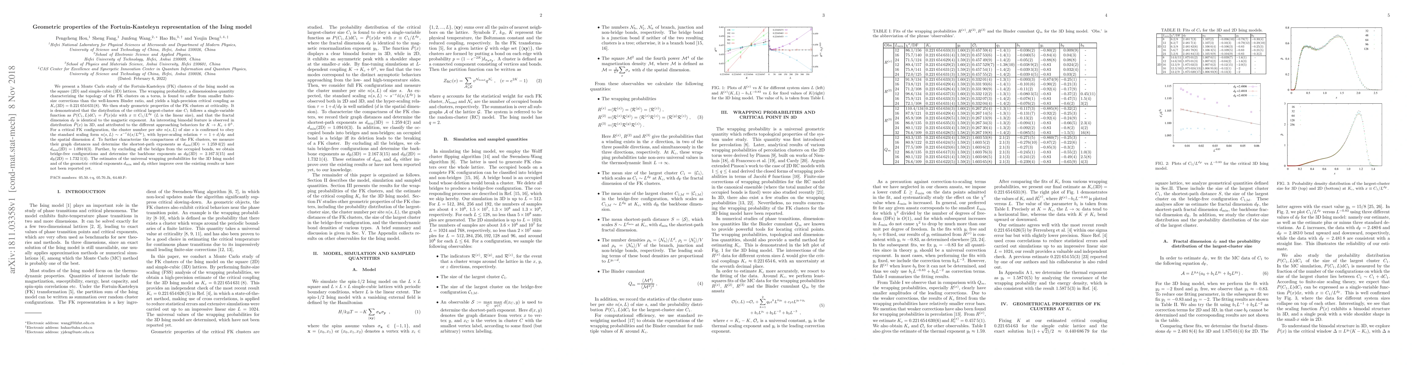 This paper conducts a Monte Carlo study of Fortuin-Kasteleyn clusters in the Ising model on 2D and 3D lattices, finding precise critical coupling values and geometric properties of the clusters. Notably, the wrapping probability shows smaller finite-size corrections than the Binder ratio, and the largest-cluster size distribution follows a single-variable function with a fractal dimension matching the magnetic exponent.
