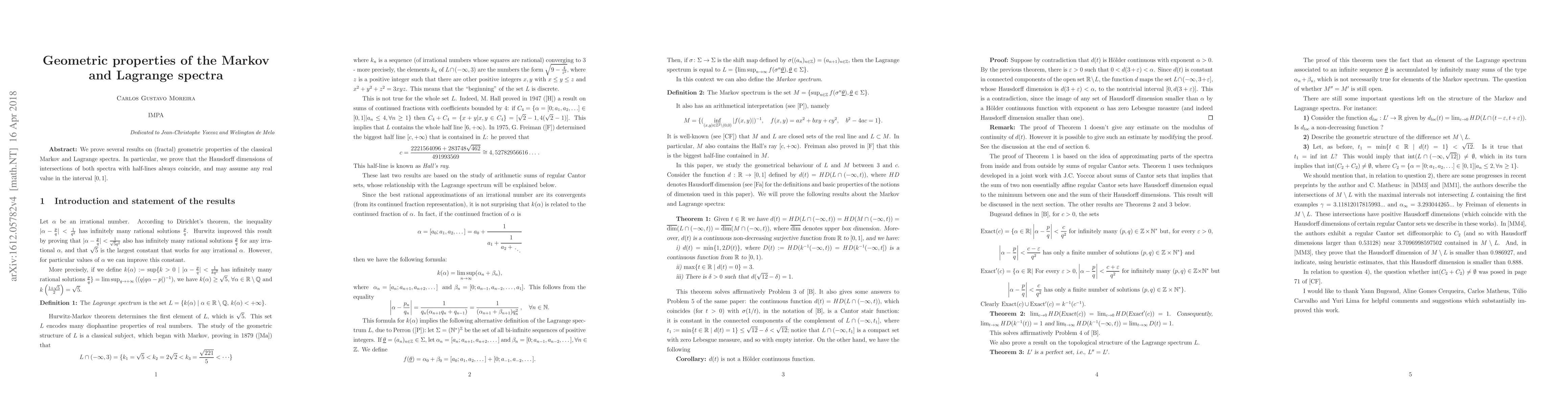 We prove several results on (fractal) geometric properties of the classical Markov and Lagrange spectra. In particular, we prove that the Hausdorff dimensions of intersections of both spectra with half-lines always coincide, and may assume any real value in the interval $[0, 1]$.