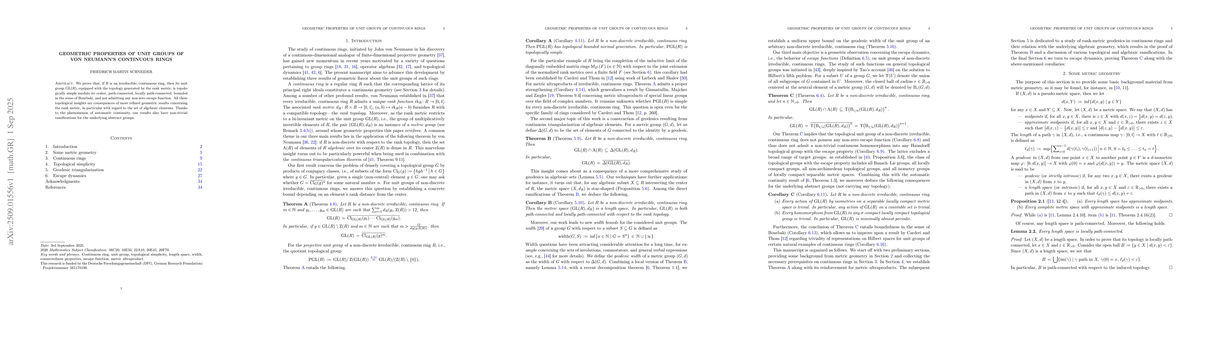 We prove that, if $R$ is an irreducible, continuous ring, then its unit group $\mathrm{GL}(R)$, equipped with the topology generated by the rank metric, is topologically simple modulo its center, path-connected, locally path-connected, bounded in the sense of Bourbaki, and not admitting any non-zero escape function. All these topological insights are consequences of more refined geometric results concerning the rank metric, in particular with regard to the set of algebraic elements. Thanks to the phenomenon of automatic continuity, our results also have non-trivial ramifications for the underlying abstract groups.