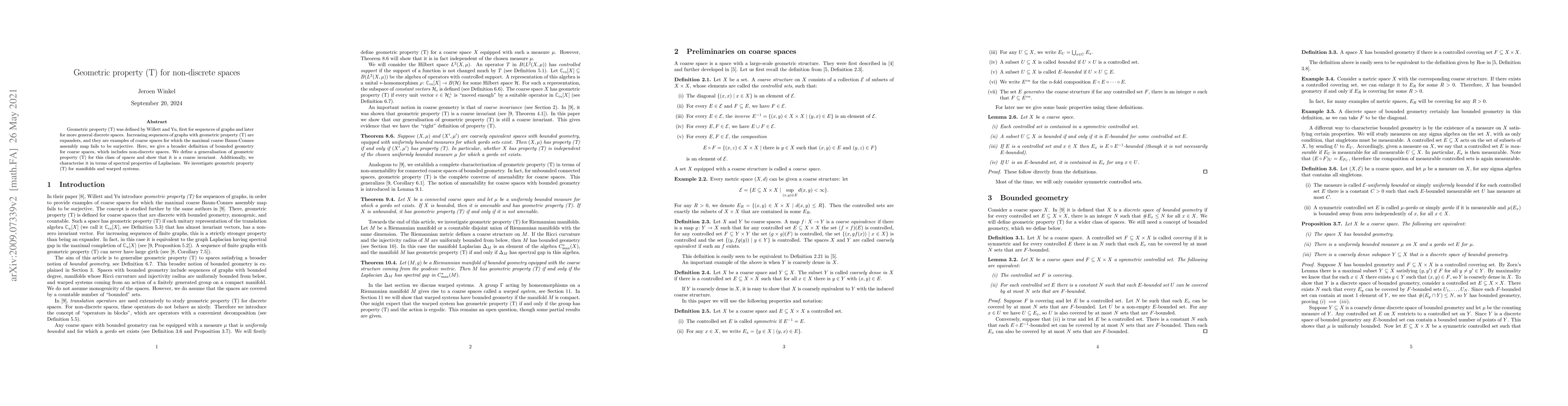 This paper extends the concept of geometric property (T) from discrete to non-discrete spaces, defining it for spaces with bounded geometry and proving its coarse invariance. It characterizes this property through spectral properties of Laplacians and explores its implications for manifolds and warped systems.