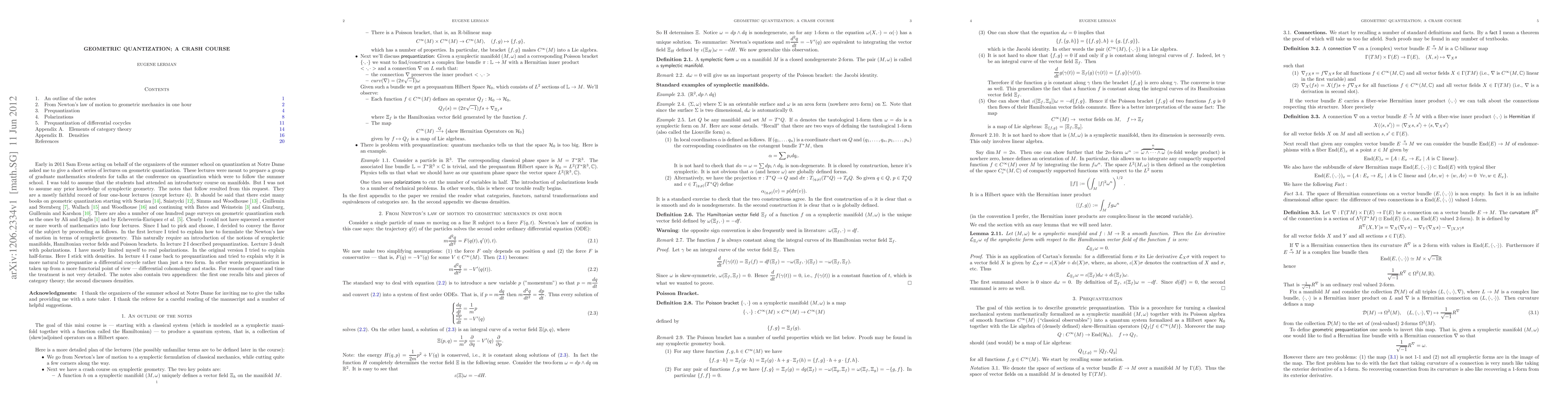 This paper provides a concise overview of geometric quantization, based on a series of lectures aimed at preparing graduate students for a subsequent conference on quantization. It includes four one-hour lecture notes and two appendices on category theory and densities.