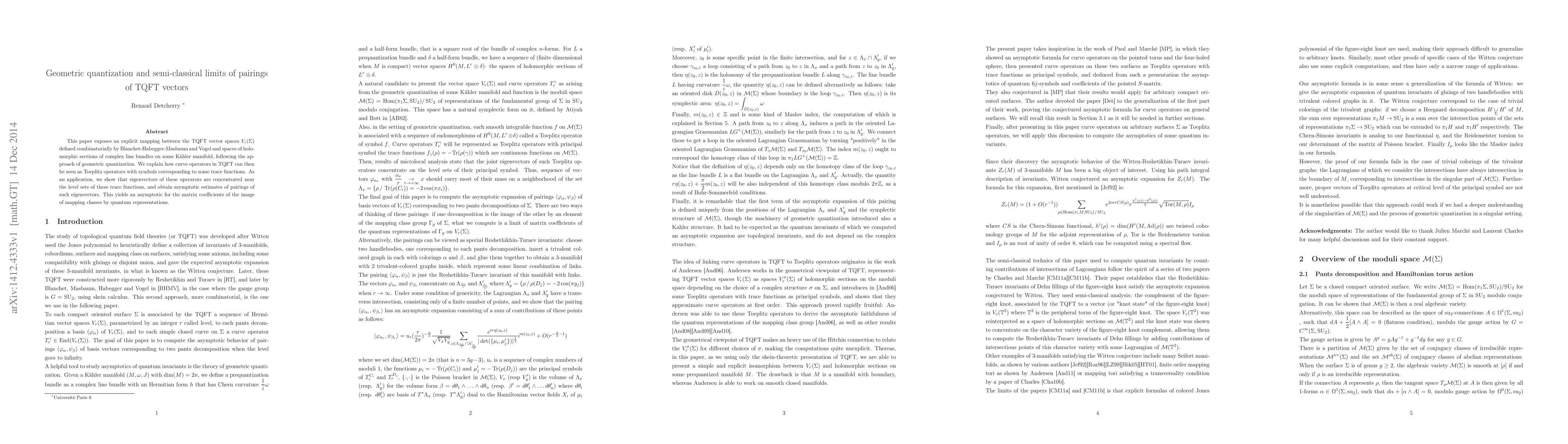 Researchers used geometric quantization to analyze TQFT vectors of Witten-Reshetikhin-Turaev theory, finding that eigenvectors are concentrated near specific levels and providing an asymptotic estimate for pairings.